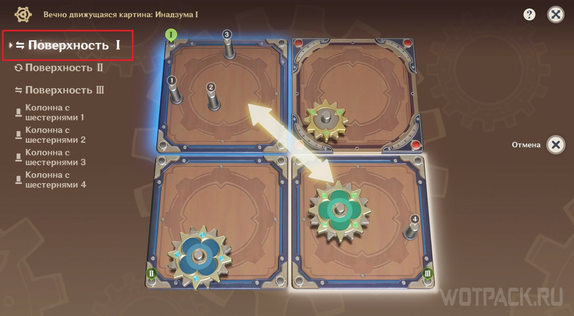 - Поверхность I. Меняйте ее местами с плитой, на которой расположена зеленая шестеренка и одна колонна.
