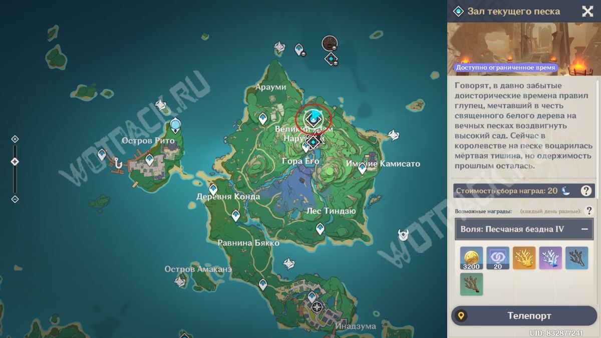 - Коралловую, драгоценную, нефритовую и золотую ветвь внешних морей можно выбить в подземелье «Зал текущего песка» каждый понедельник, четверг и воскресенье. Расположено оно на острове Наруками в Инадзуме, прямо позади и немного ниже Великого храма.