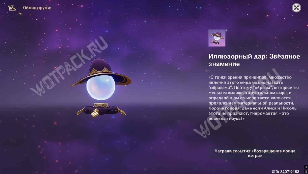 Кто не понял, как экипировать, жмете на перса, который носит катализатор (пример Ян Фей, Ситлали, Сахароза и тд, их очень много), там будет значок вешалки в правом нижнем углу, жмете на него, выбираете вкладку Оружие (самая нижняя), там будет опция со скином Иллюзорный дар: Звездное знамение, выбираете его, жмете Сменить — вуаля, ваш перс с новым скином, который подходит максимум Моне или Лизе в ее дефолт скине, лол