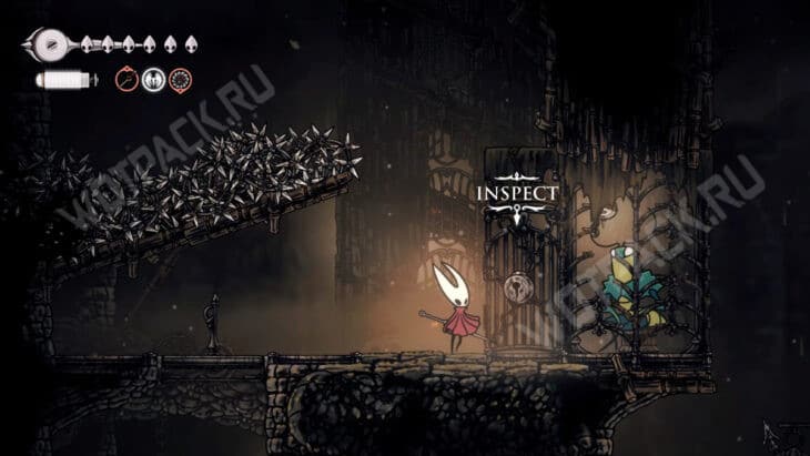 Проще попасть к узнику от сломанной лавки в центре локации — там же находится и карта текущей местности. Покиньте помещение через восточный проход и спрыгните в провал между ближайшими клетками. Используя мобильные способности, огибайте скопления шипов и спускайтесь до дна.