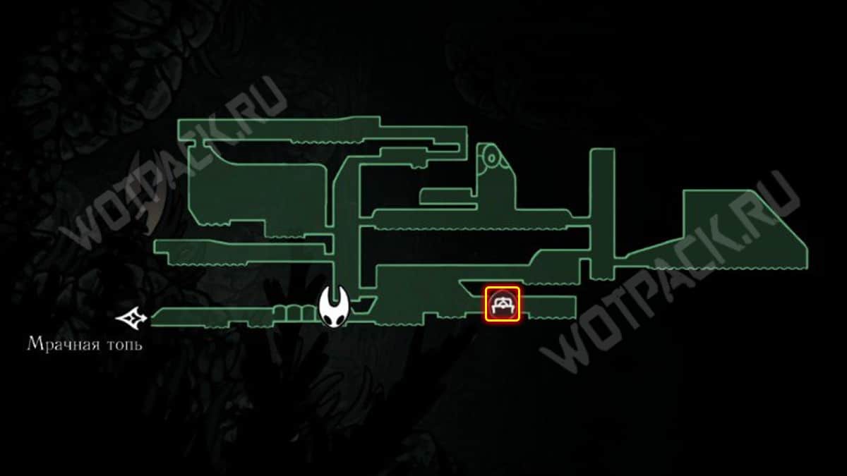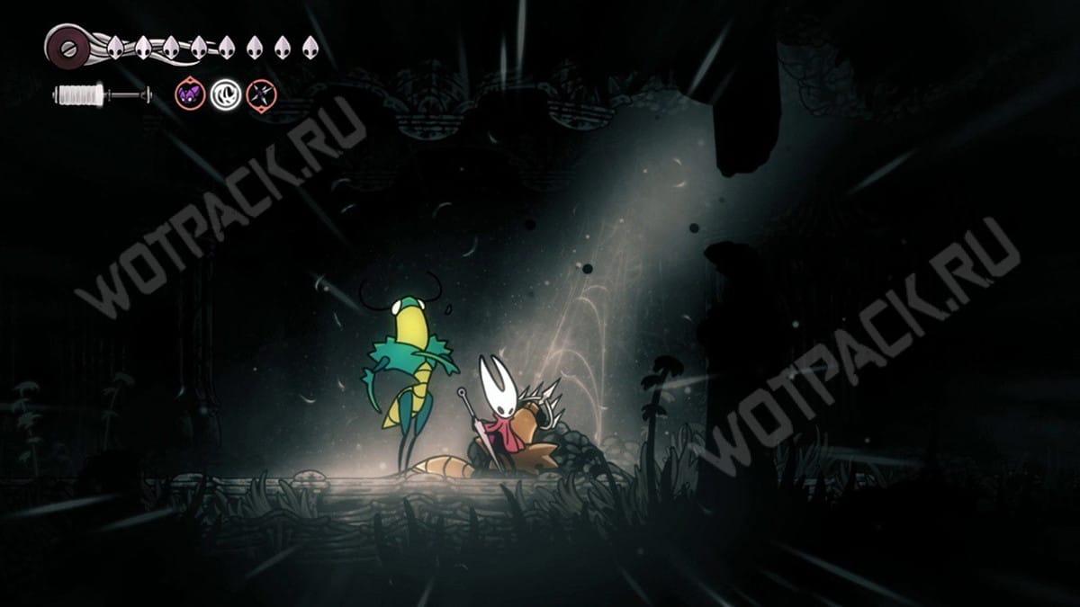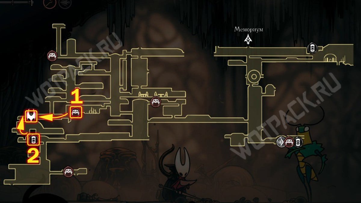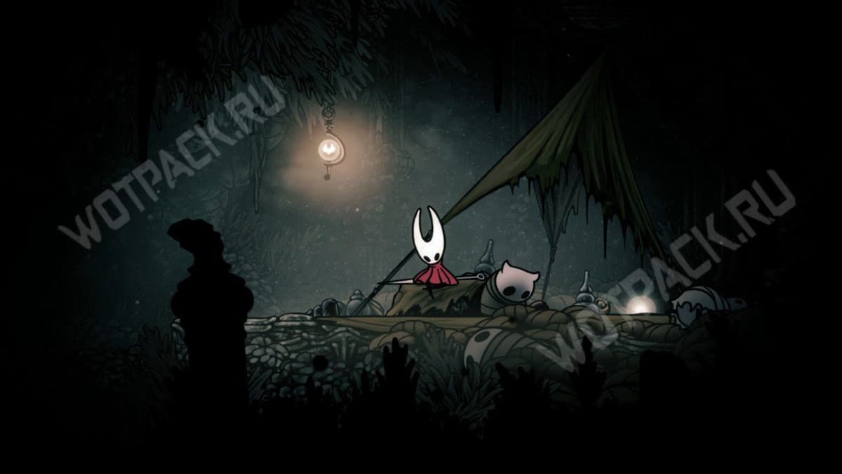 Это место доступно только до перехода в память богомола — в оазисе из воспоминаний лавки не будет. Сломайте стену на востоке, перелетите ямы с шипами и через платформы доберитесь до заброшенного лагеря пилигримов. Обязательно возьмите карту и сохранитесь перед посещением соседних районов королевства.