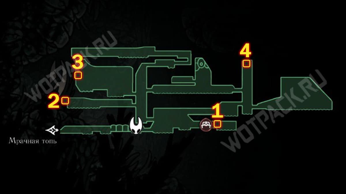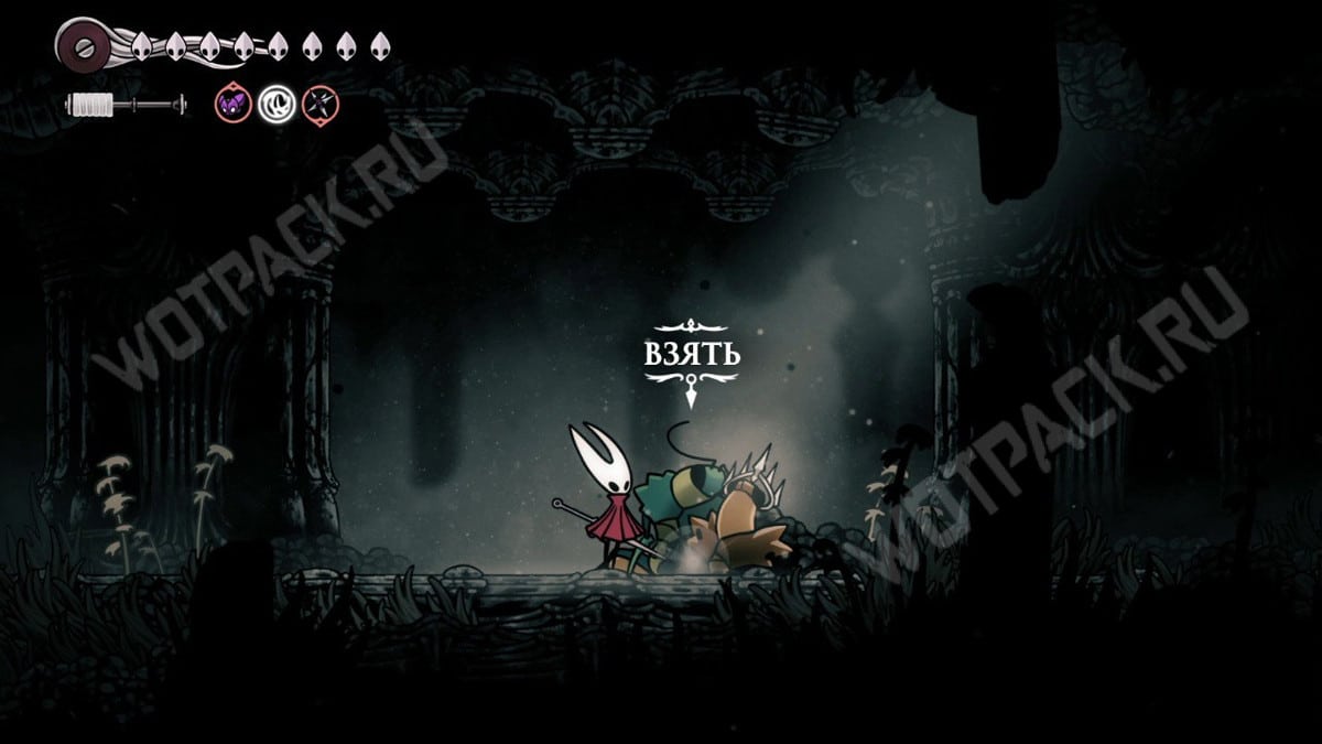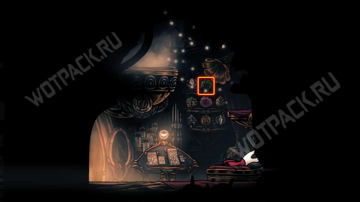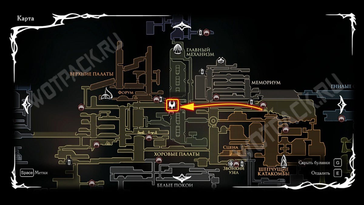 Это место доступно только до перехода в память богомола — в оазисе из воспоминаний лавки не будет. Сломайте стену на востоке, перелетите ямы с шипами и через платформы доберитесь до заброшенного лагеря пилигримов. Обязательно возьмите карту и сохранитесь перед посещением соседних районов королевства.