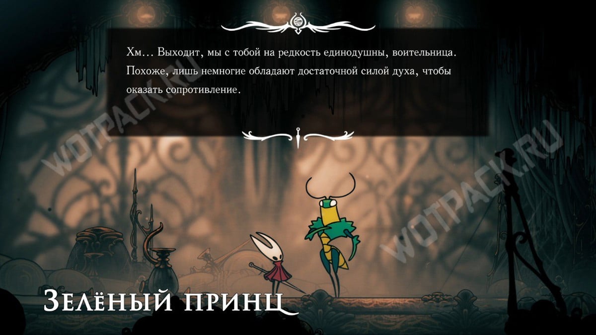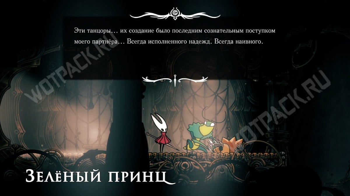 В указанном месте, над останками одного из танцоров, будет сидеть Зеленый королевич. Если его не обнаружите, то продвиньтесь далее по сюжету, откройте мирное убежище и вернитесь на арену. Данный диалог позволит начать основную беседу рядом с Мрачной топью во время финальной главы.