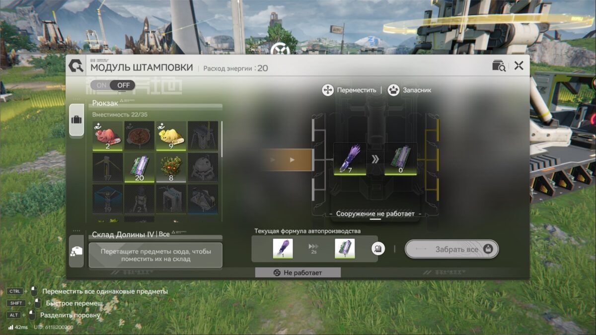 Перетяните аметистовые детали из правой панели в основной «Инвентарь» слева. В рюкзаке должно оказаться как минимум 30 единиц ресурса.