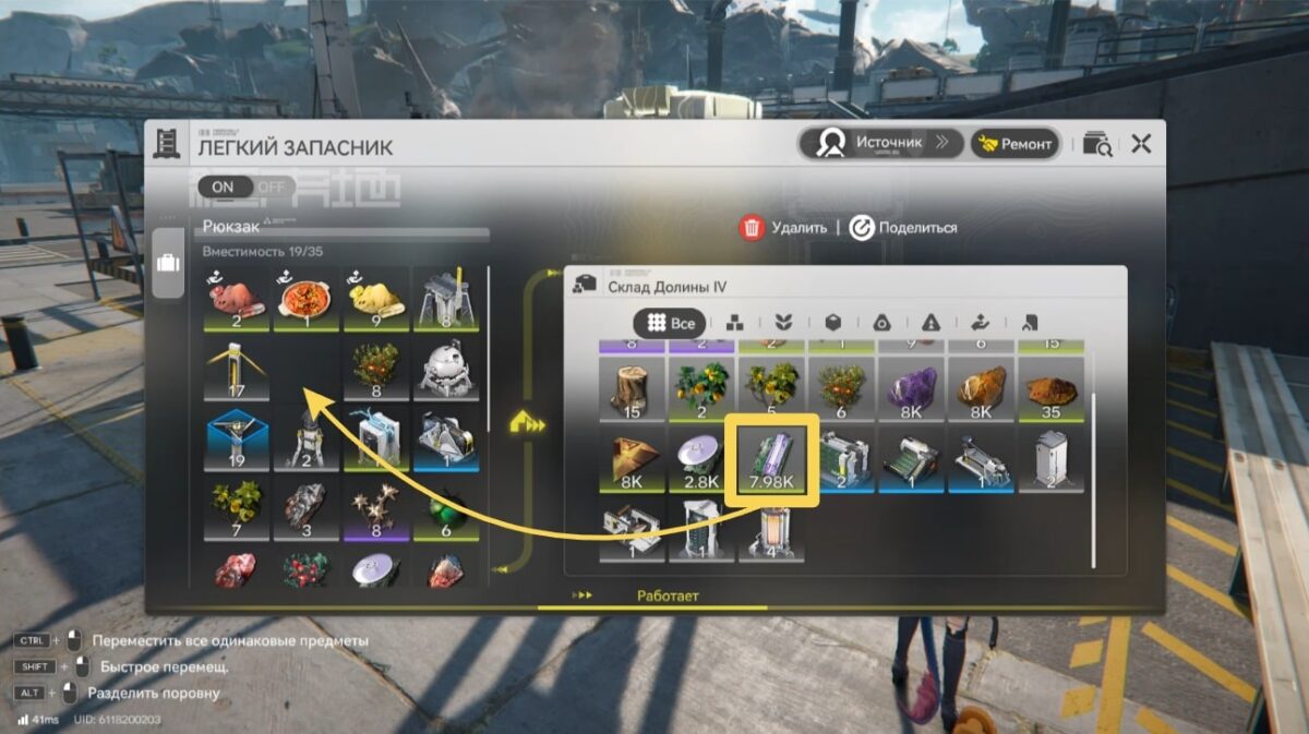 Подойдите к лёгкому запаснику, расположенному рядом с первым устройством питания. С его помощью можно удобно пользоваться складом в бездорожье.