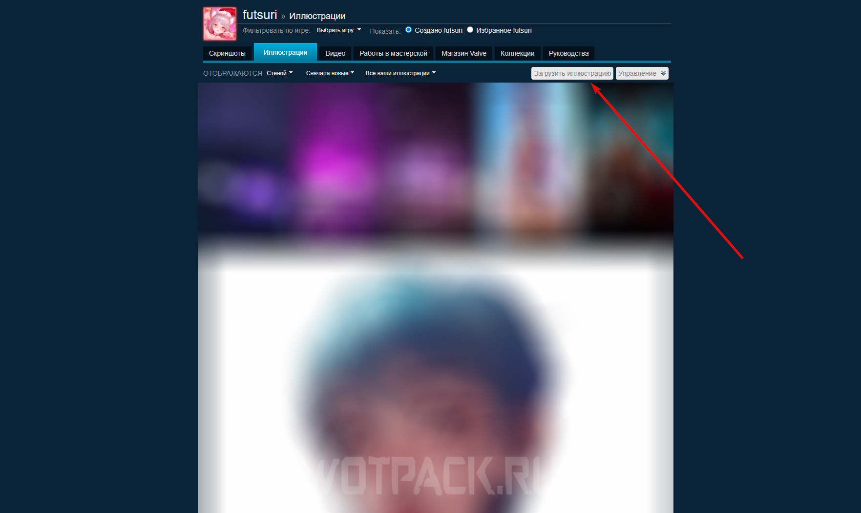 Чтобы сделать витрину иллюстраций, необходимо сначала загрузить в профиль несколько картинок, в противном случае увидите сообщение «витрина иллюстраций недоступна вашему аккаунту». В профиле кликните «Иллюстрации», затем в верхней части экрана нажмите «Загрузить иллюстрацию». Введите название игры, либо же кликните «Не из игры».