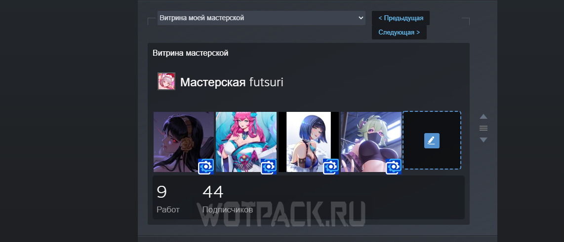 Кликните Enter, после чего загрузите изображения или гифки одну за другой. Остается лишь перейти в профиль и перенести все эти работы в витрину мастерской.