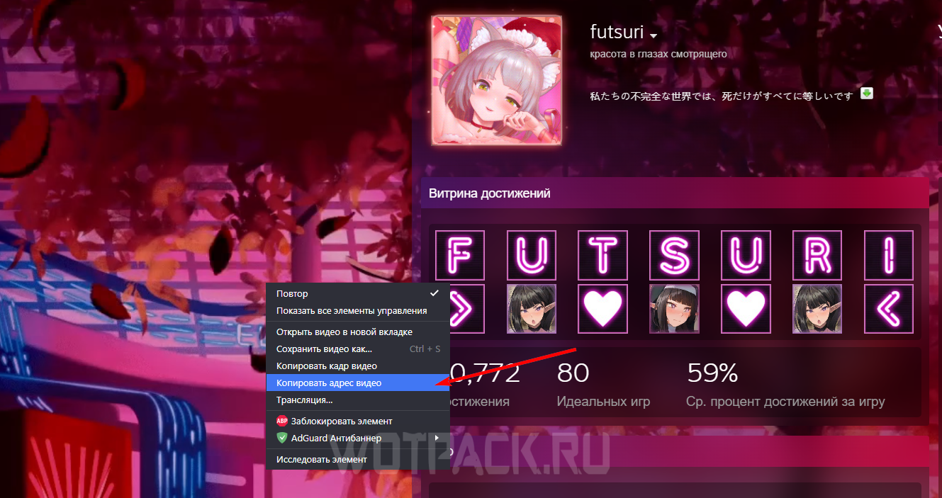 Один из наиболее популярных способов оформить профиль – анимированные витрины для стима. Приобретя статичный или динамичный фон, зайдите с браузера и кликните правой кнопкой мыши по заднику. Затем скопируйте его адрес, нажав «Копировать адрес видео». Для неподвижных фонов необходимо зайти в инвентарь, открыть страницу предмета, после чего нажать на «Показать в полном размере», а уже оттуда скопировать ссылку.