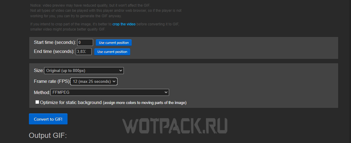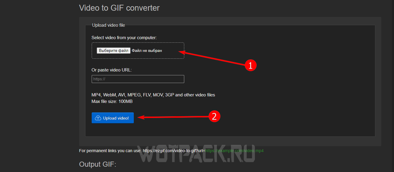 Получив файл формата MP4, заходите на любой конвертер, например на ezgif. Рассмотрим работу с данным сайтом. В стим можно загрузить файл, размер которого не превышает 5 МБ. Необходимо провести с видео ряд манипуляций: