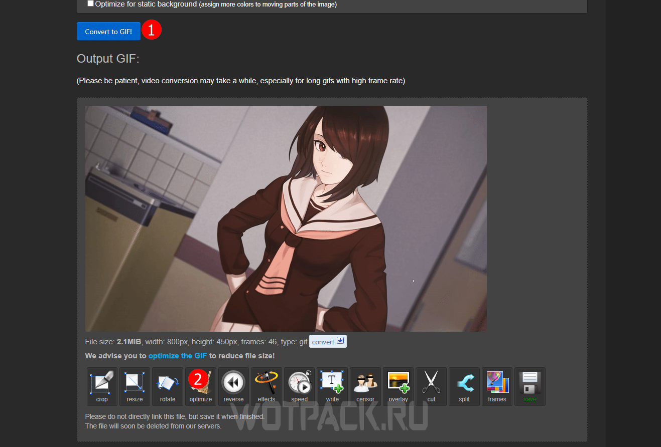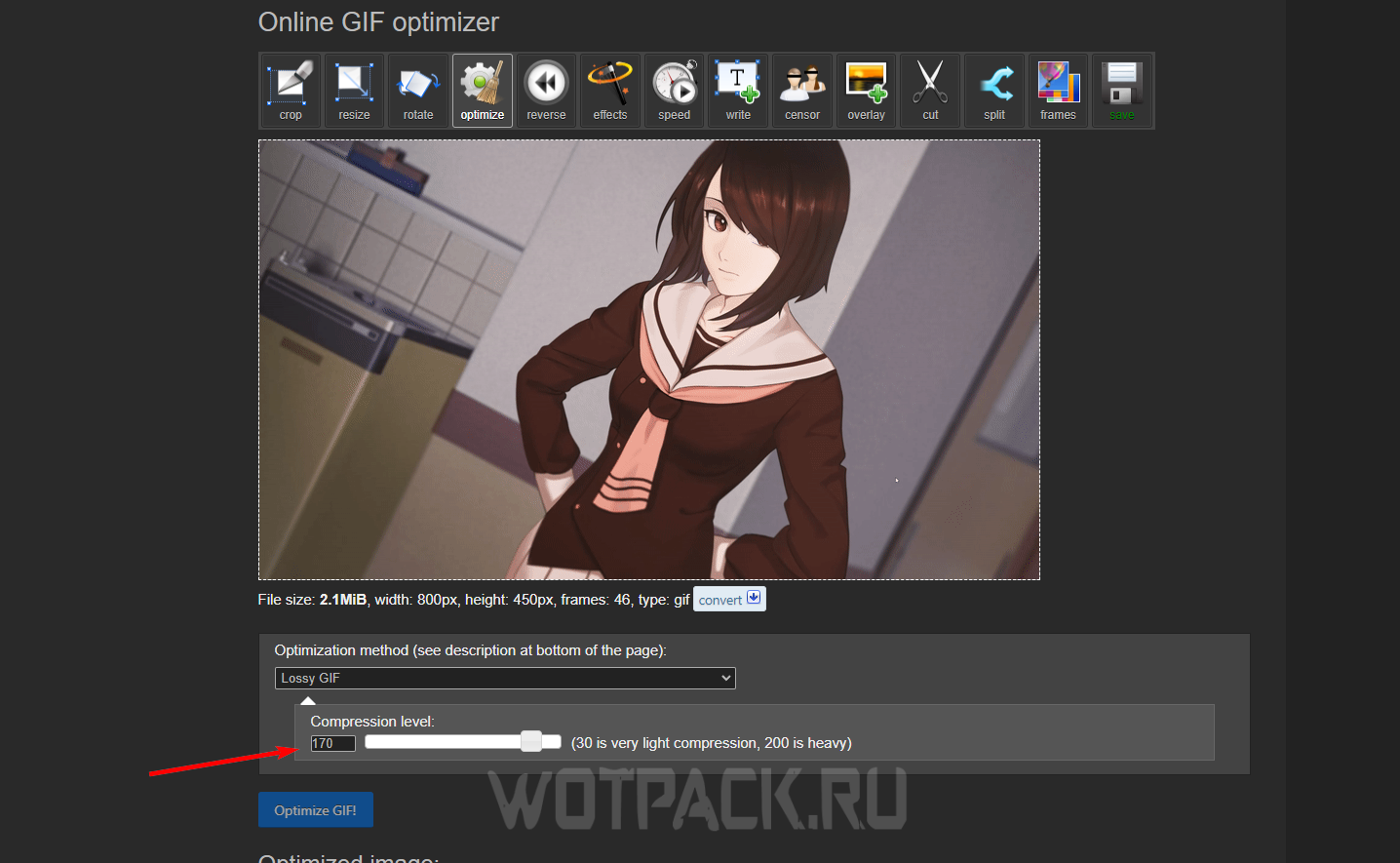 Если на выходе вес больше, чем ~4.8MB, кликните на «Convert to Gif», а затем на «Optimize». Покрутите ползунок и постарайтесь подогнать вес под требуемый. Теперь просто скачайте обе гифки, которые только что обработали.