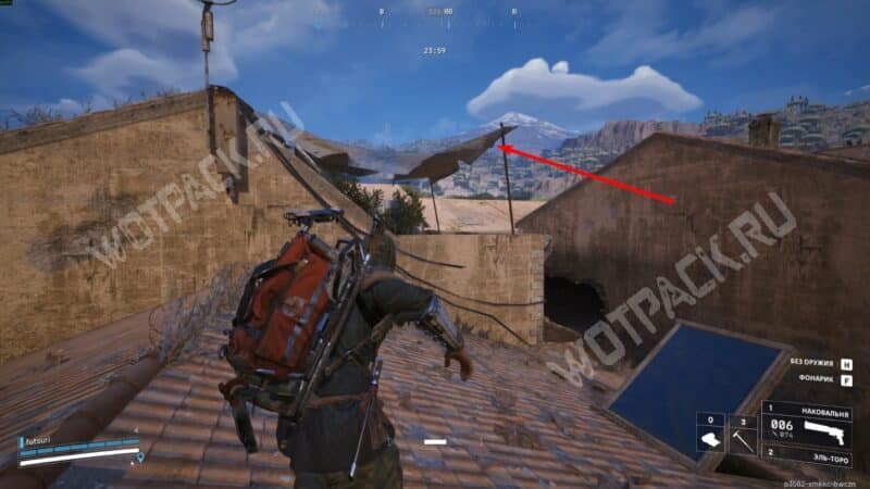Сперва найдите уединенную террасу на крыше, для этого отправляйтесь в нижнюю часть Погребенного города, к локации «Плаца Роза». На юго-западе от неё расположены засыпанные песком домики. Среди множества зданий отыщите крышу, на которой растянут синий брезент — это именно та терраса.