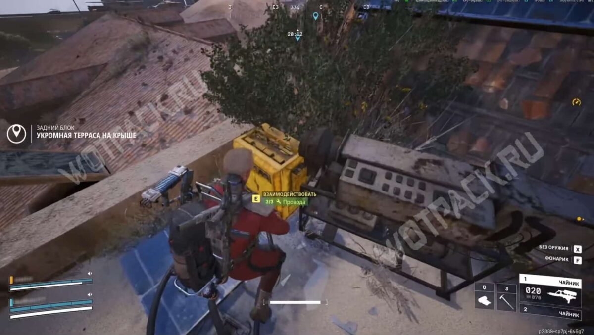 Забирайтесь на крышу и взаимодействуйте с электрическим щитом: при активном квесте объект будет отмечен жёлтым цветом. Вставьте внутрь три провода и почините механизм, после чего квест завершится. Если нужных предметов в инвентаре нет, всегда можно найти их рядом: