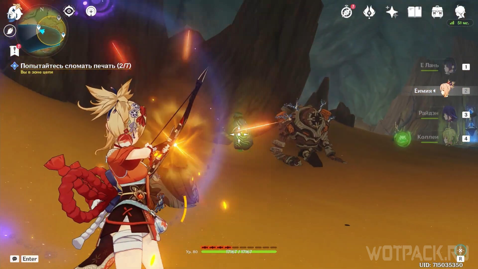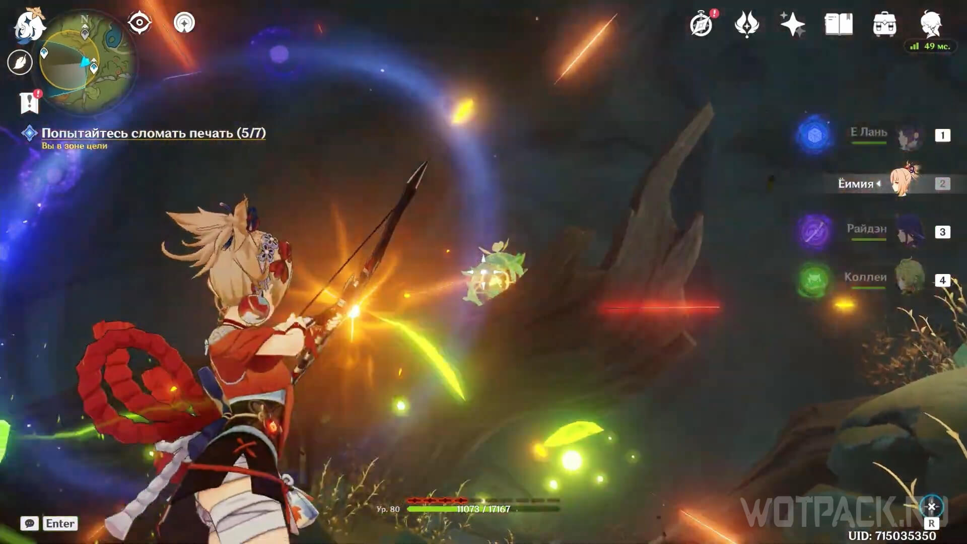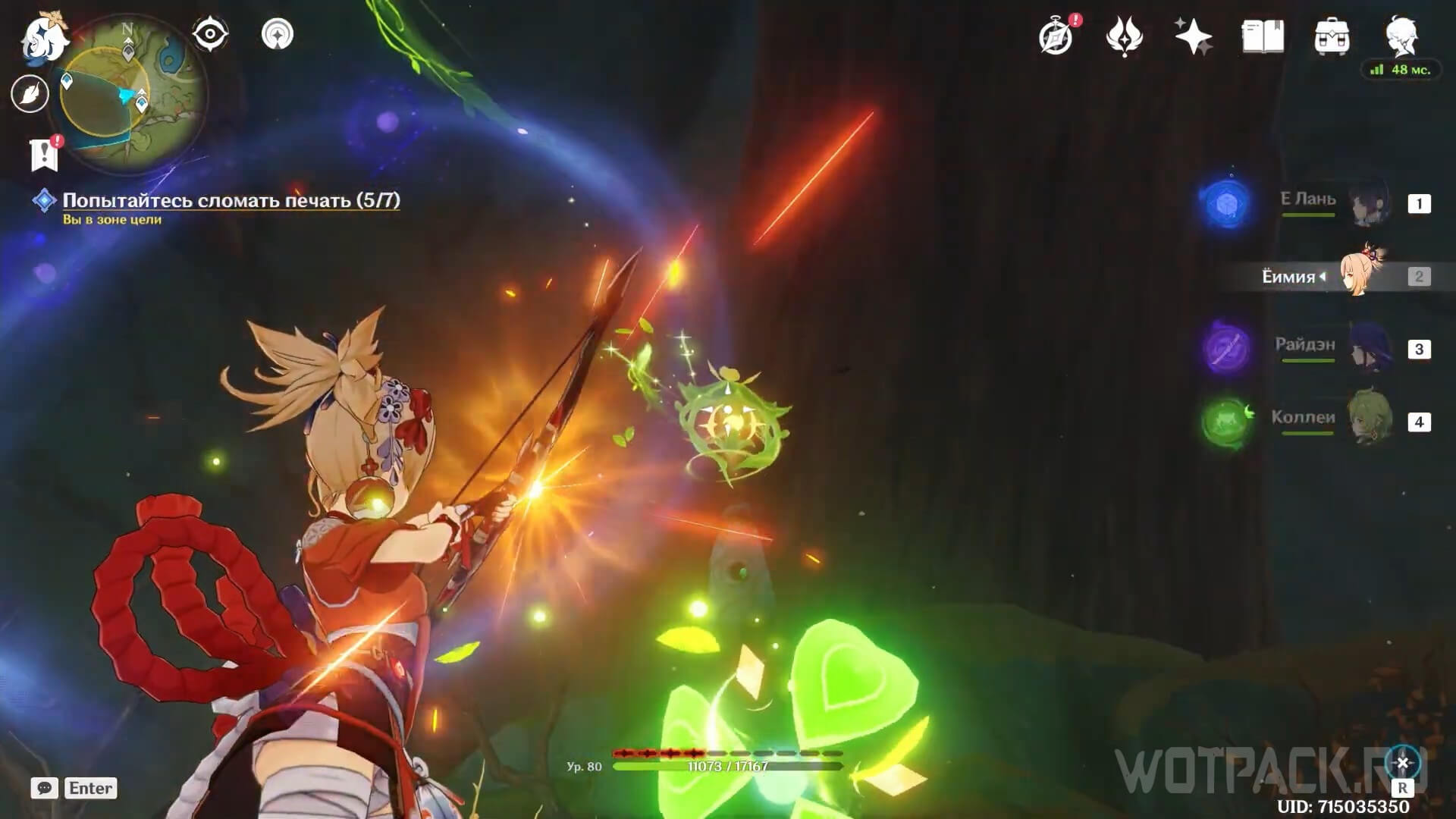 Используйте Дендрогранумы, чтобы активировать появляющиеся в зале Дендро эмблемы. При помощи прицельной атаки лучников запустите заряды по каждой из эмблем, чтобы открыть проход в последний зал.