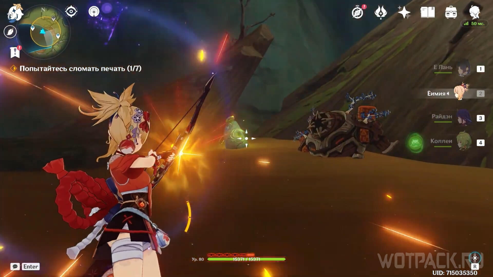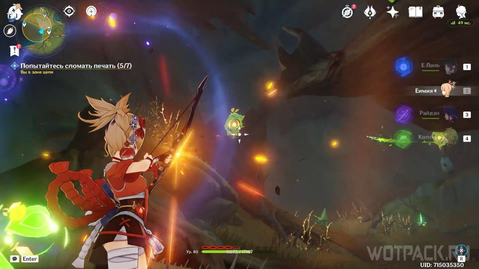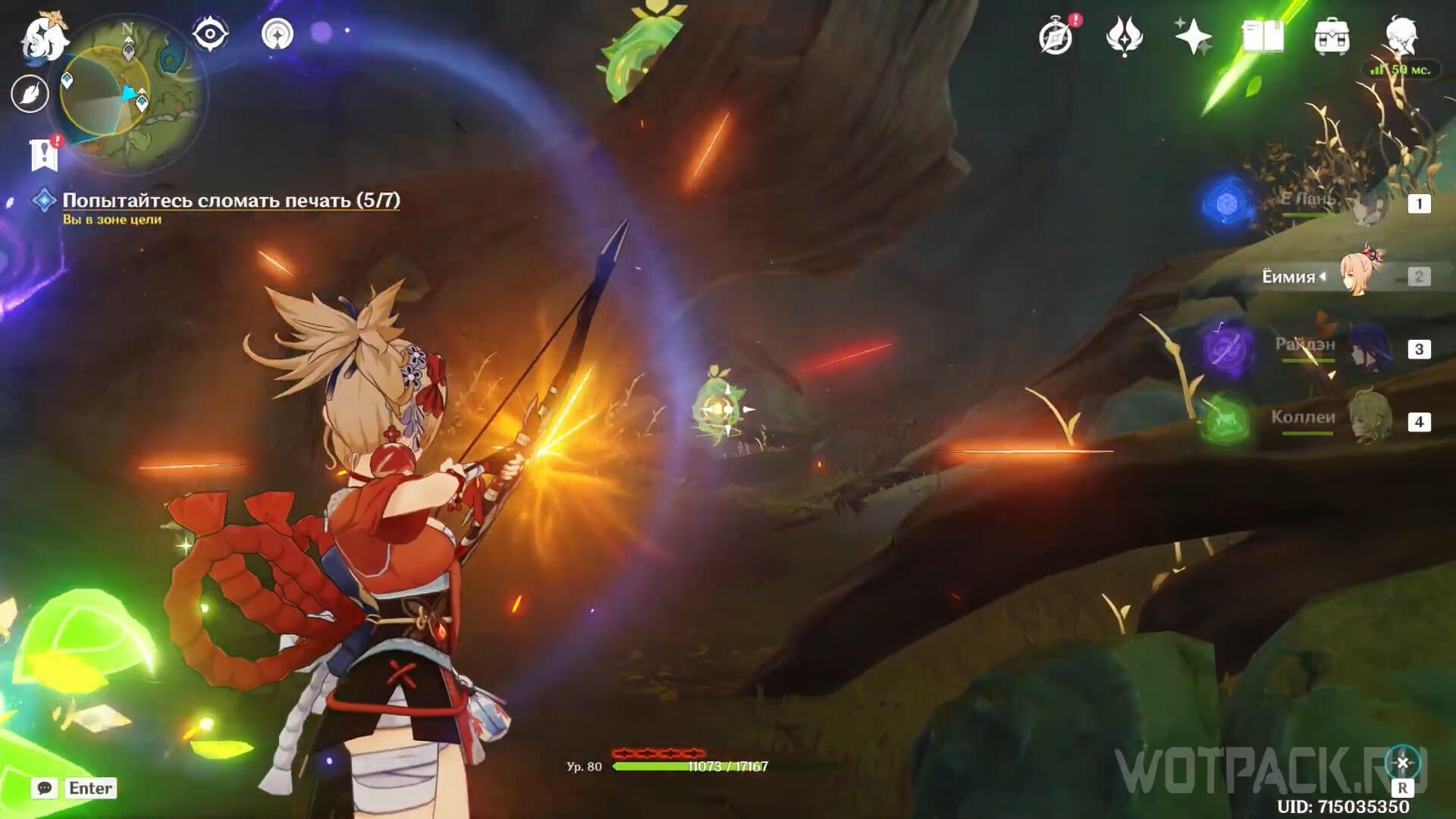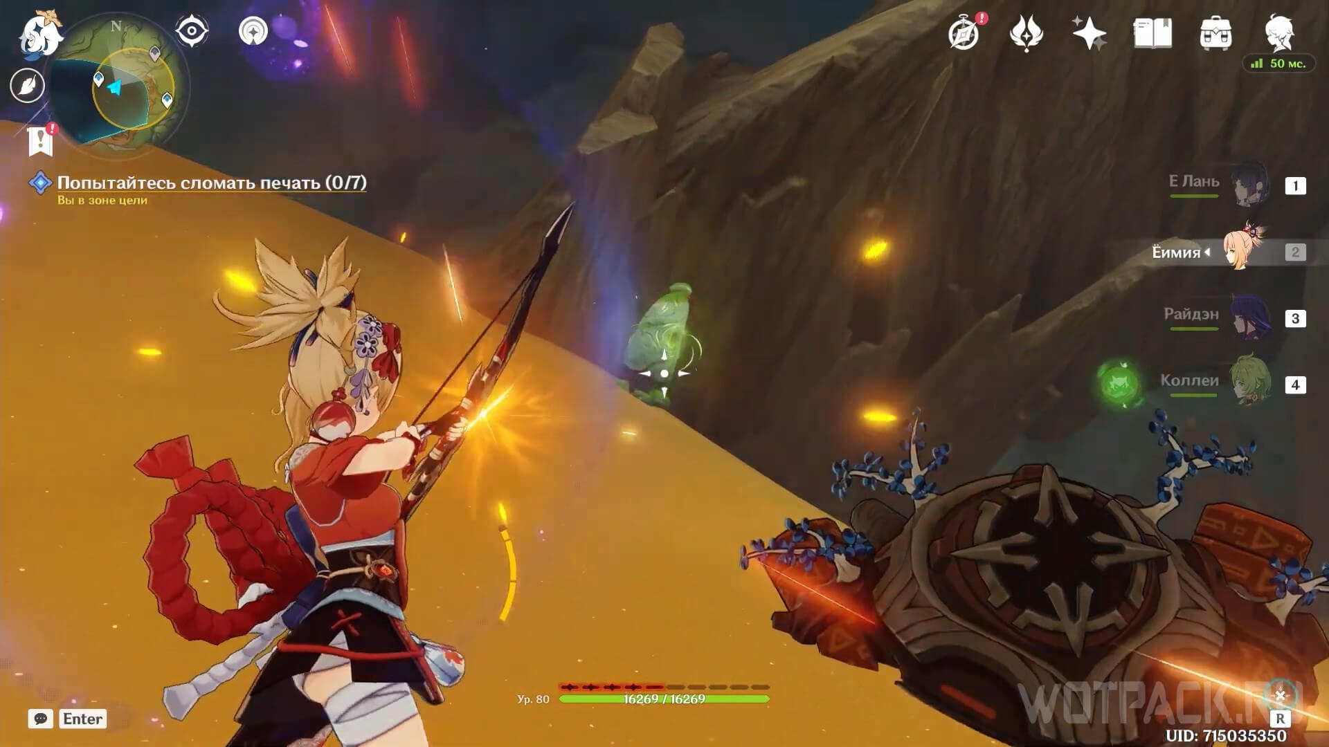 Используйте Дендрогранумы, чтобы активировать появляющиеся в зале Дендро эмблемы. При помощи прицельной атаки лучников запустите заряды по каждой из эмблем, чтобы открыть проход в последний зал.