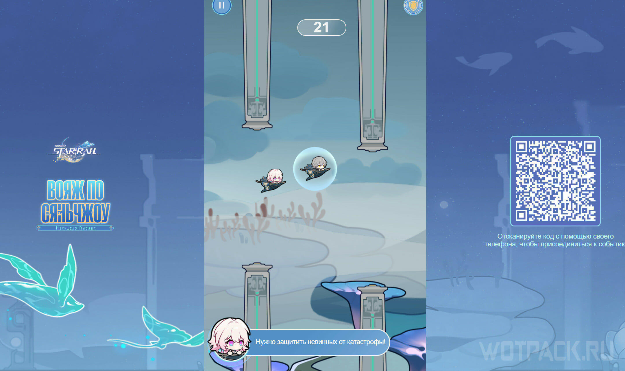 Основная активность веб-ивента Вояж по Сяньчжоу – мини-игра Flappy Bird. В начале забега Первопроходец получает случайное усиление: уменьшение модельки, щит и многое другое, а во время полета может встретить компаньонов. Если врежетесь, есть возможность продолжить игру, просмотрев трейлер версии 1.2. Дистанция «вояжа» влияет не только на собственные награды, но и на общий прогресс, от которого зависят разыгрываемые награды.