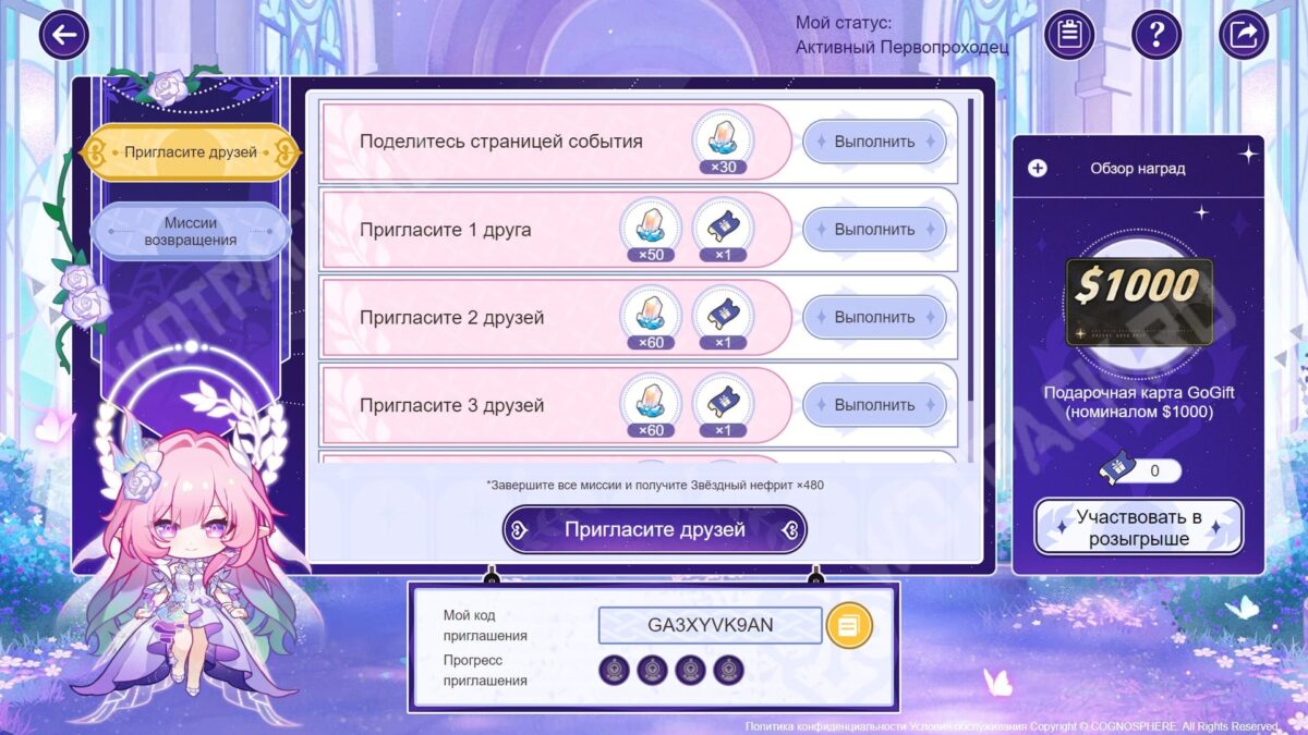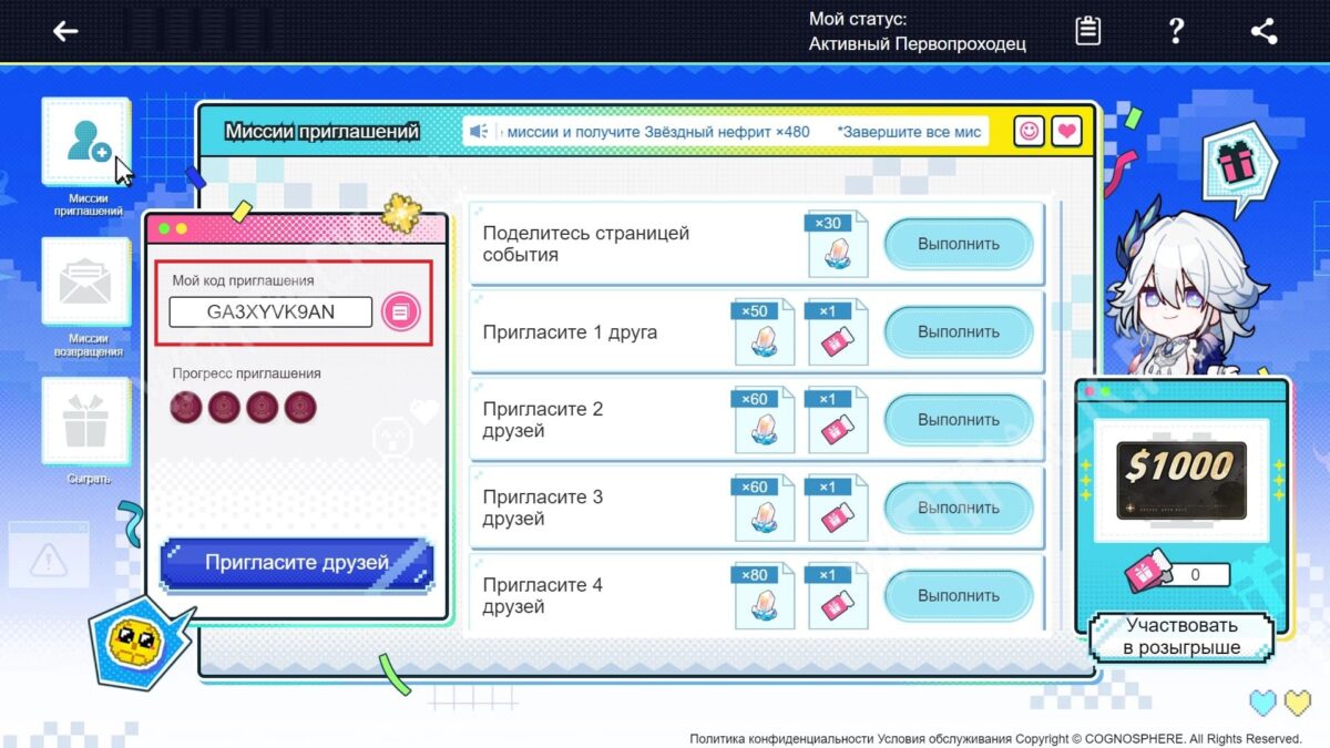 Игроки, которые не пригласили ни одного друга, но скопировали ссылку, смогут получить 30 звездного нефрита. Первопроходцы, пригласившие других игроков, которые выполнят все задания из списка, суммарно получат: