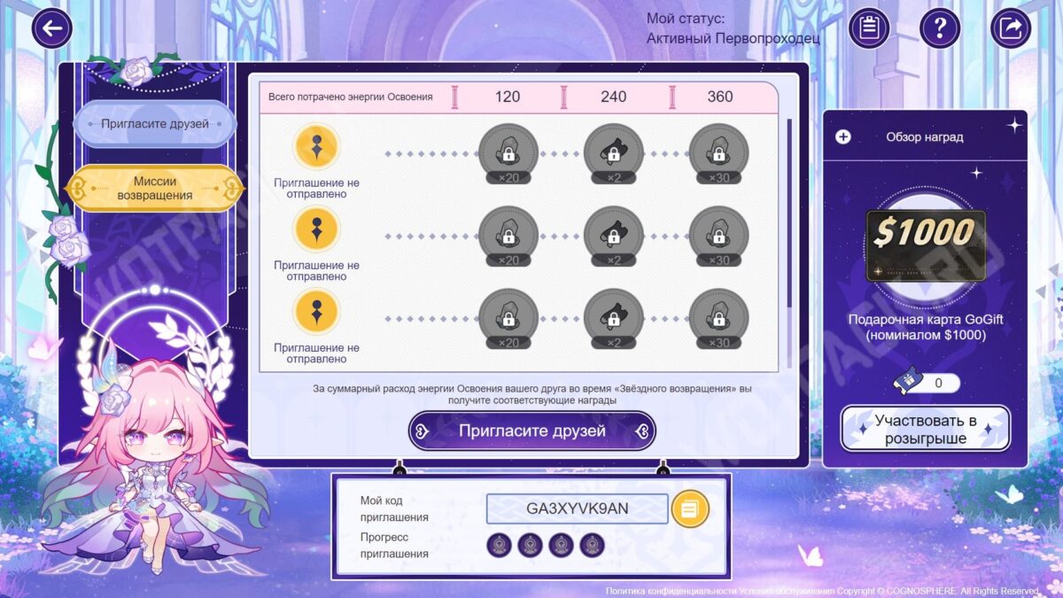 Минимальные награды в размере 30 звездного нефрита на внутриигровую почту получат все Первопроходцы, которые просто скопируют ссылку события. По приглашению должен перейти игрок, не заходивший в игру более 14 дней. Всего можно пригласить 4 друзей, за которых дадут суммарно 250 ед. звездного нефрита.