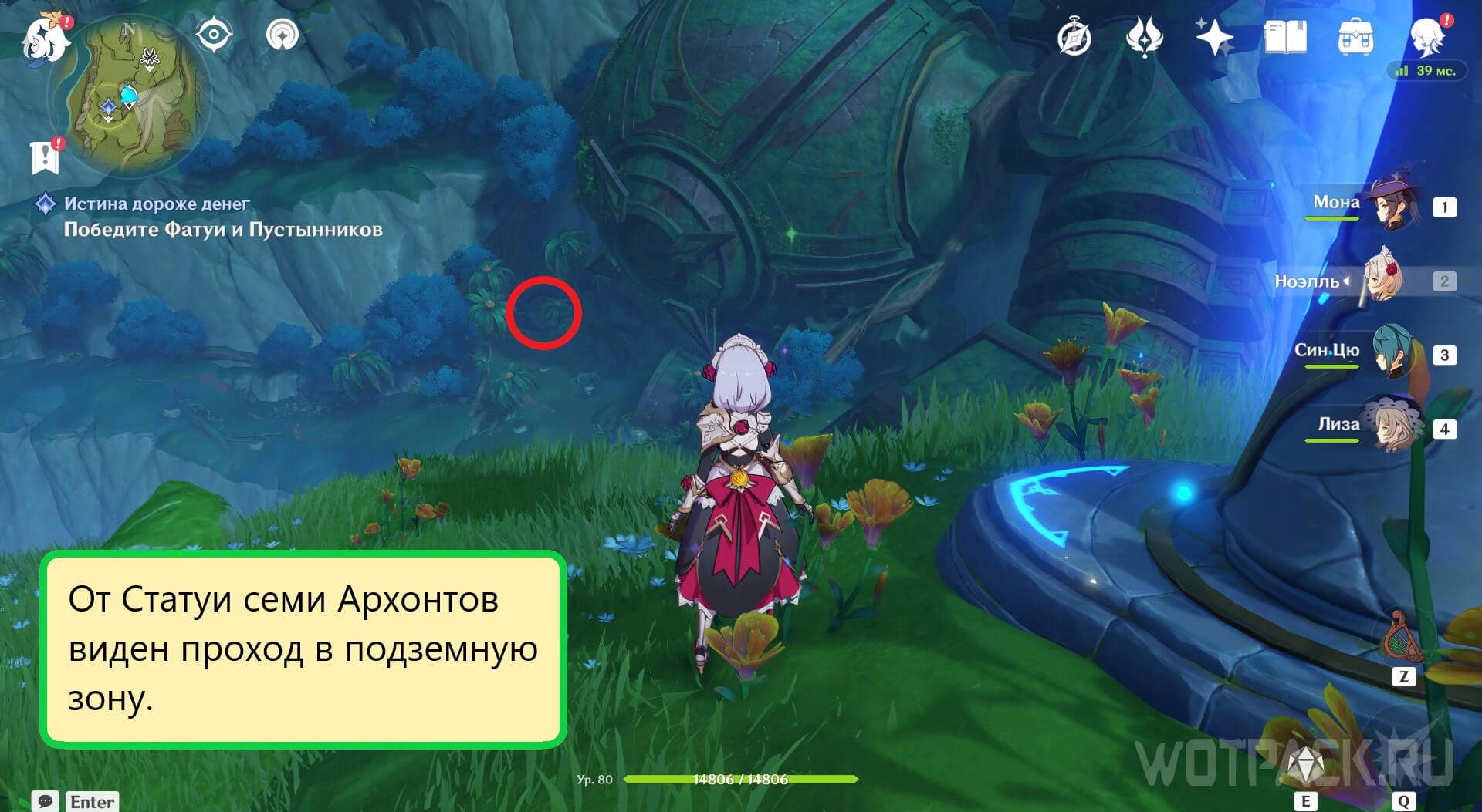 От Статуи семи Архонтов севернее предполагаемой точки назначения виден круглый вход. Парите к нему и входите внутрь. На другом конце прохода – обширная пещера с закованным стражем руин в качестве самого заметного ориентира. На скриншоте показано расположение Врат Грез относительно закованного стража.