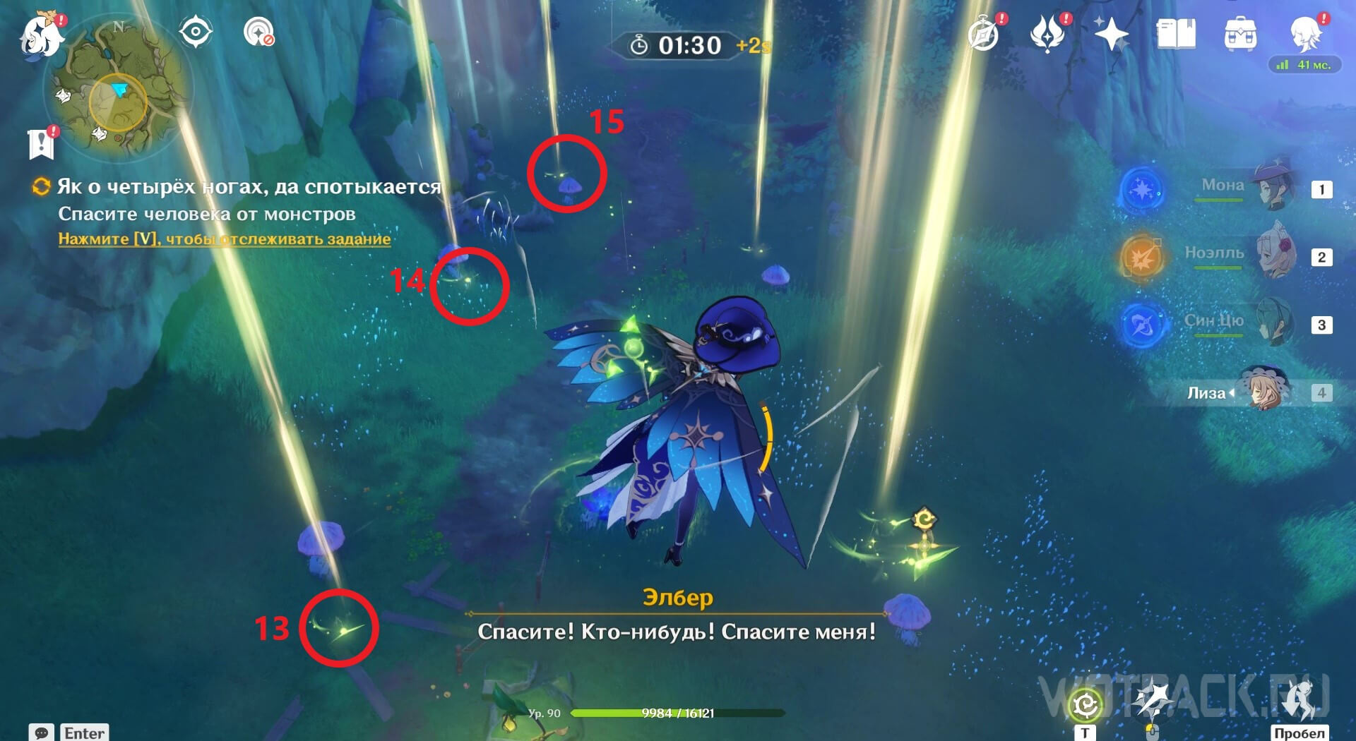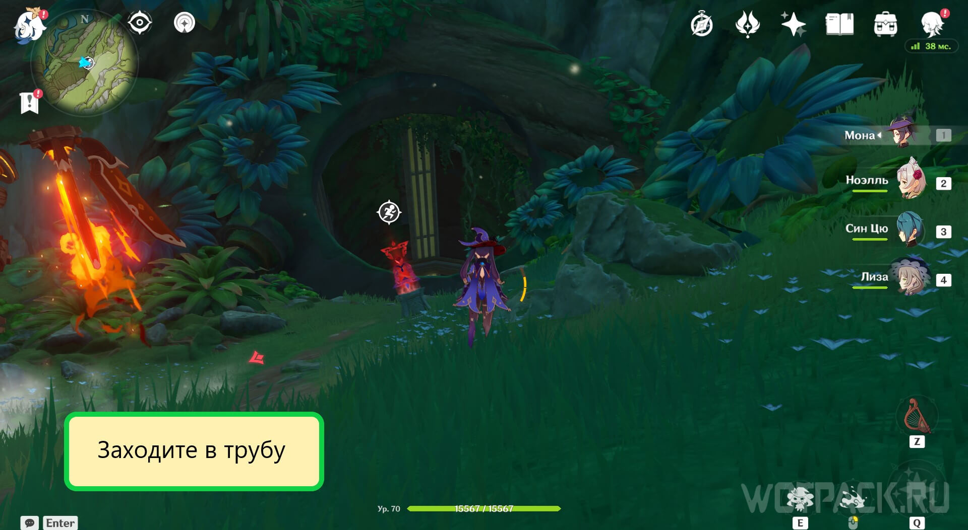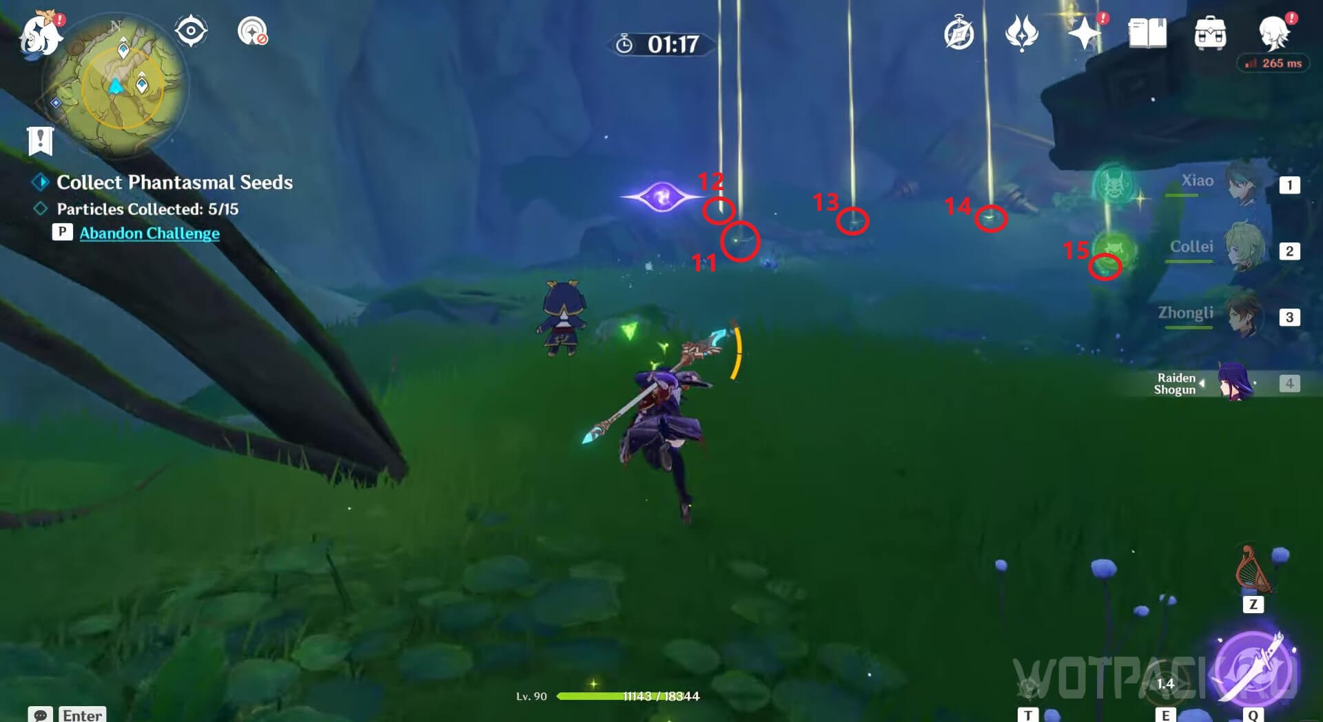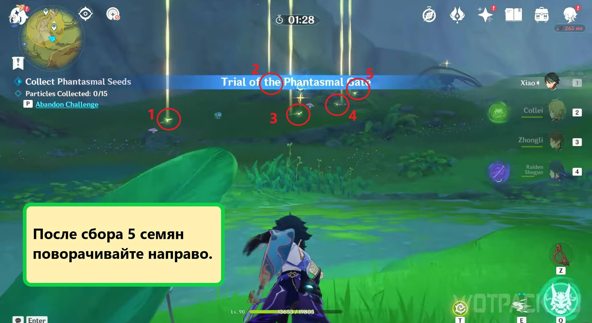 От точки телепортации приземлитесь к вратам, стоящим в открытом поле. Маршрут испытания здесь довольно прост. Первая часть прямо перед глазами, если смотреть на север. Не заденьте Дендро колючки и остерегайтесь плесенников. Совершите сбор и сразу поверните направо.