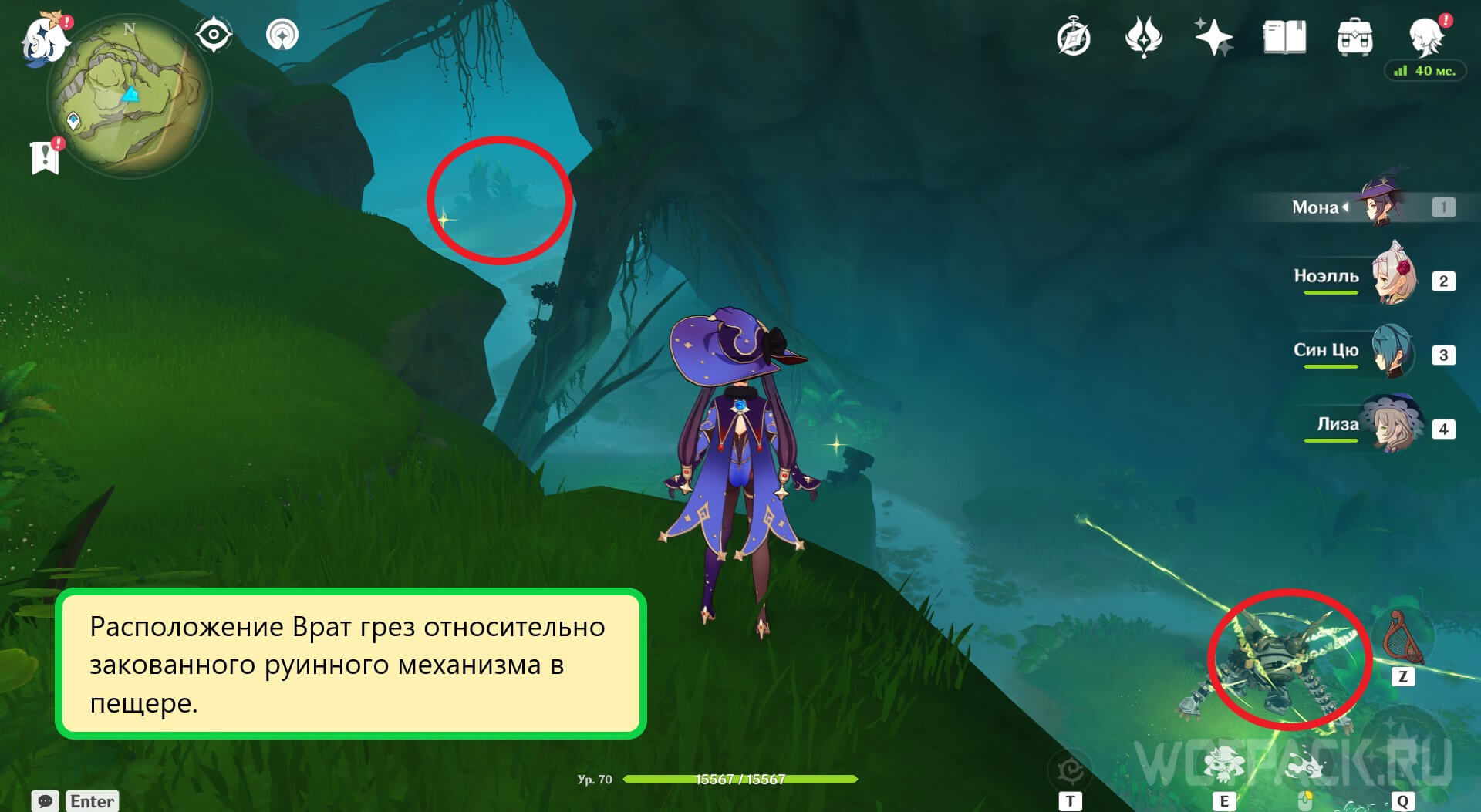 Врата расположены в чаще леса, на уровень ниже от лагеря хиличурлов. Удобно добежать до них от Статуи семи Архонтов.