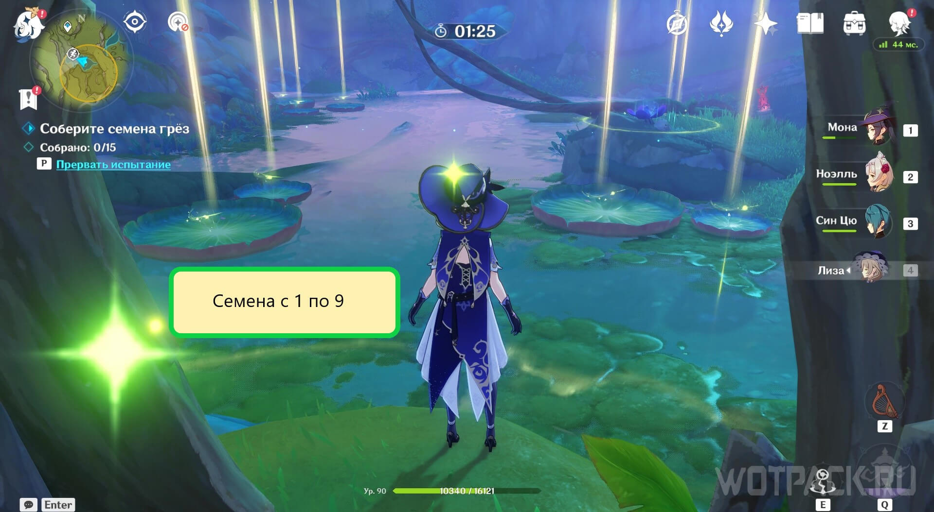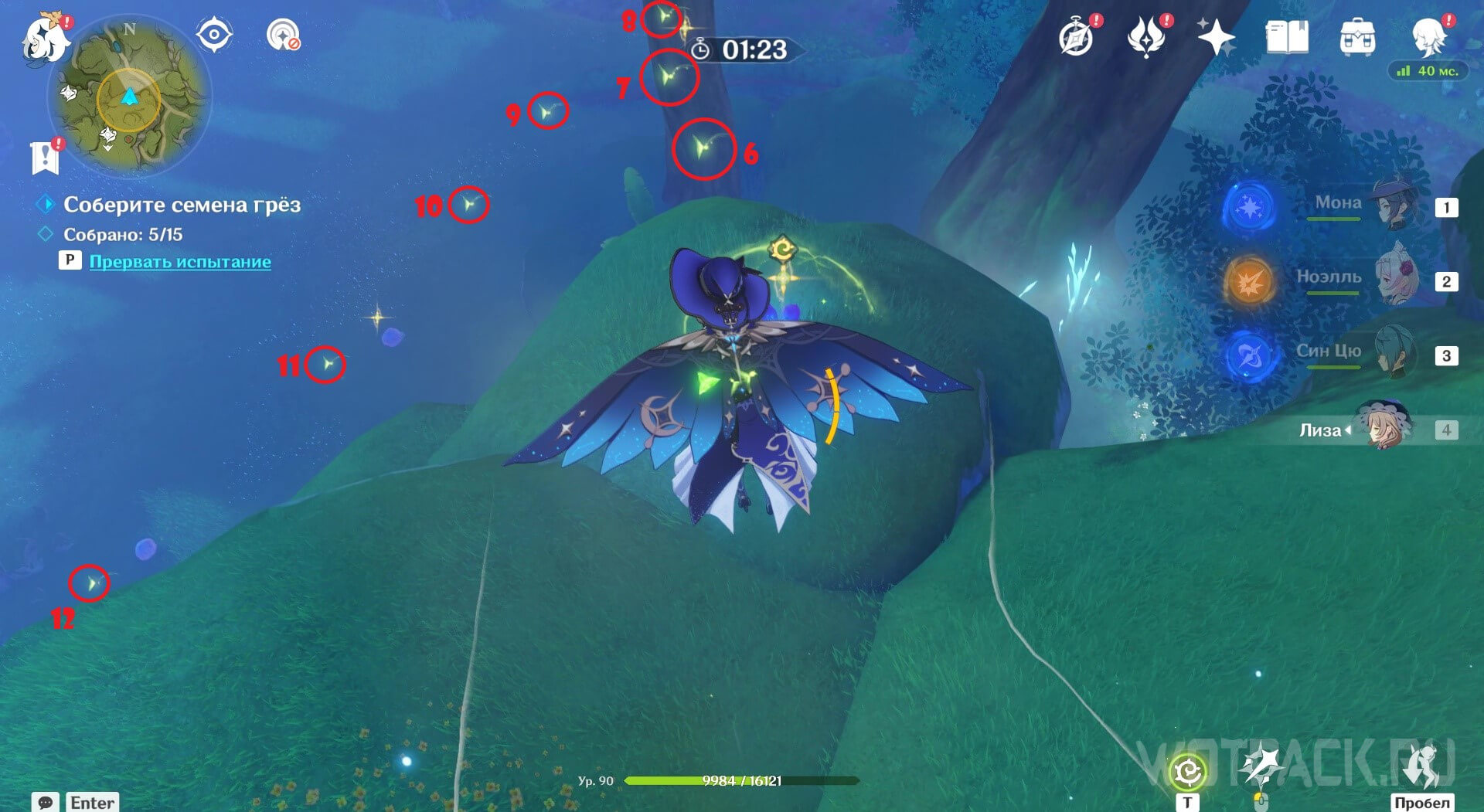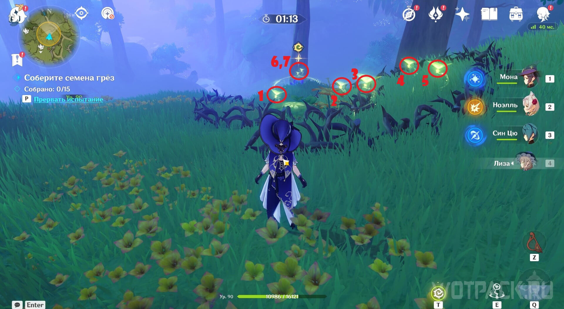 До испытания легко долететь от Статуи семи Архонтов в субрегионе Земля Ашаван. Можно условно поделить маршрут сбора семян грез на 3 зоны. Зона 1 — огороженная Дендро колючками местность с семенами в северо-западном направлении от врат. Собрав все частицы, поднимайтесь на 2 горные ступени выше.