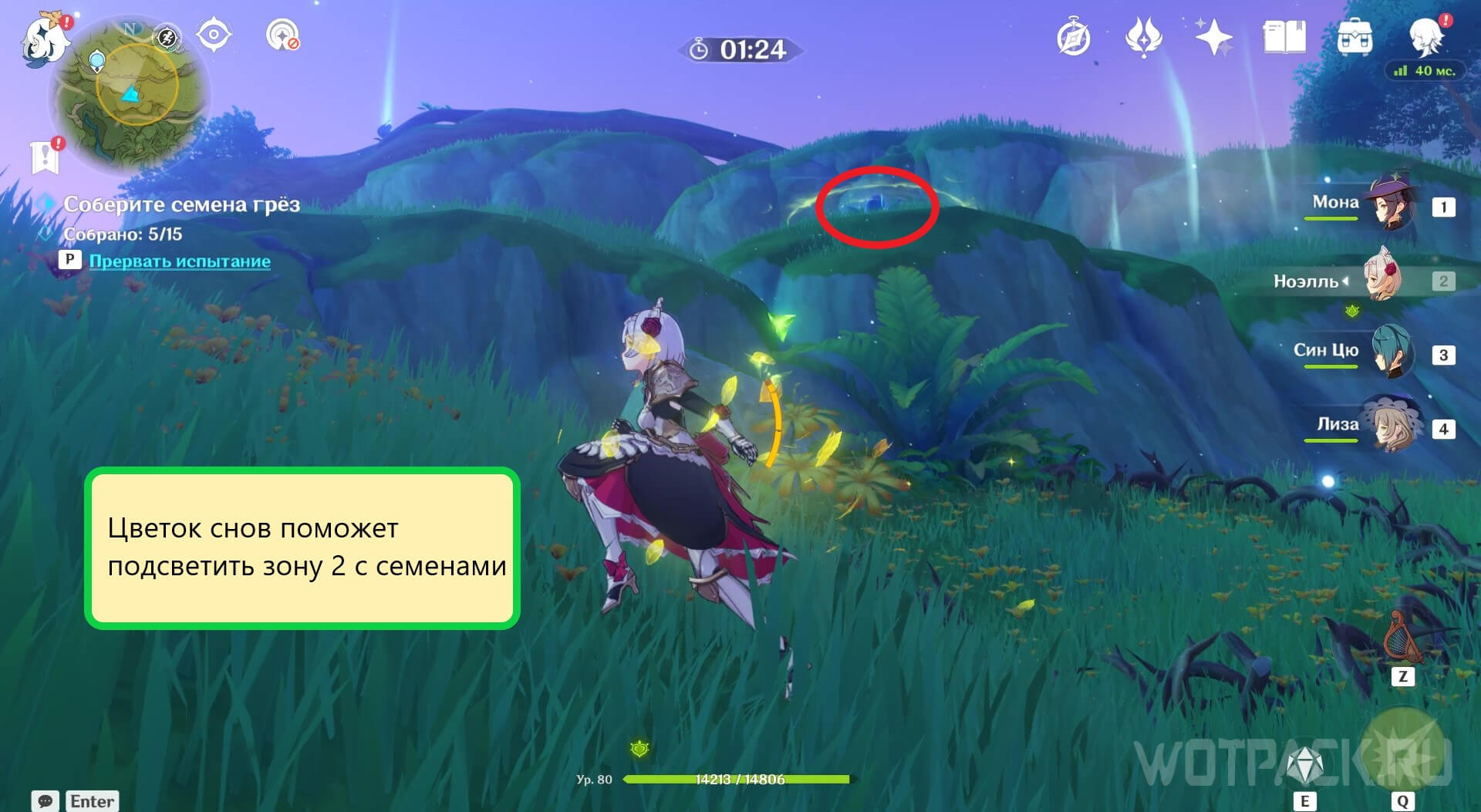 От точки телепорта взберитесь чуть выше в гору. Врата свободно стоят на вершине. В рамках испытания игрок опишет изящную дугу для сбора всех семечек грез. Финишной чертой маршрута можно считать Анемо поток, отображенный на втором скриншоте. Он также поможет вернуться за семенами, которые не получилось схватить с первой попытки.