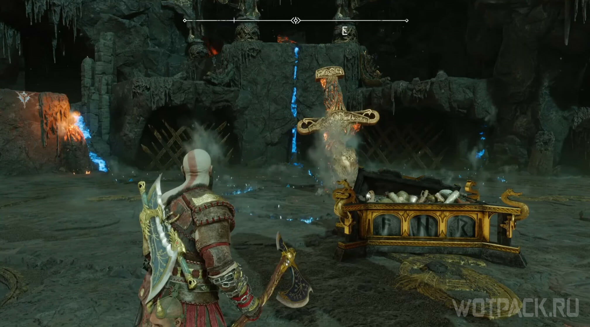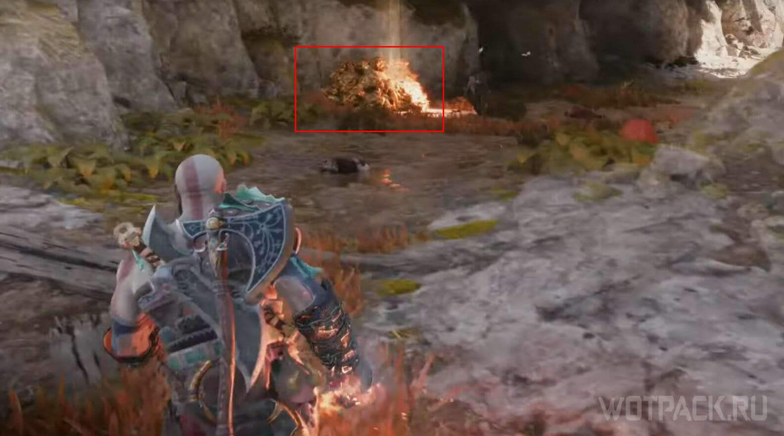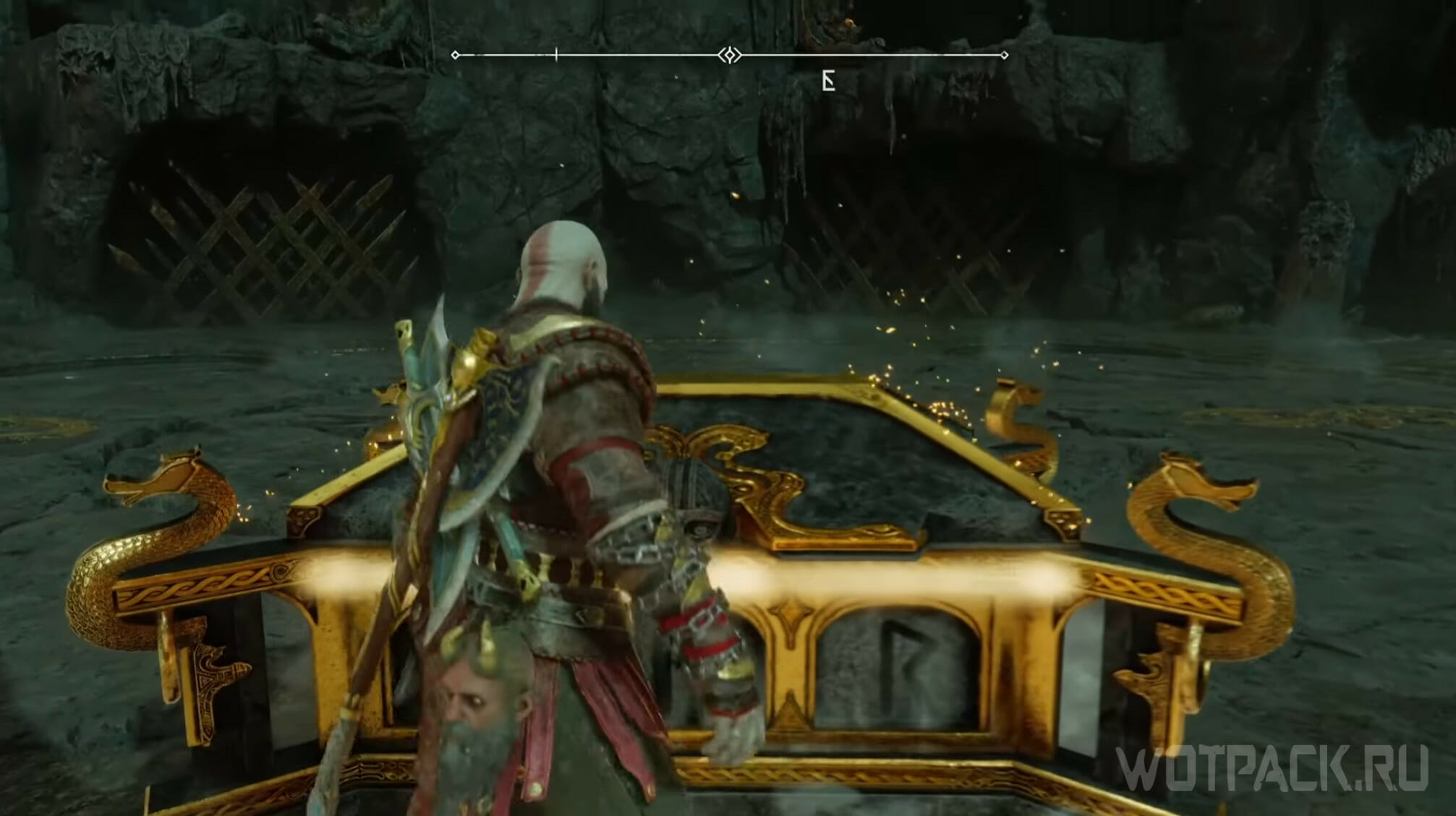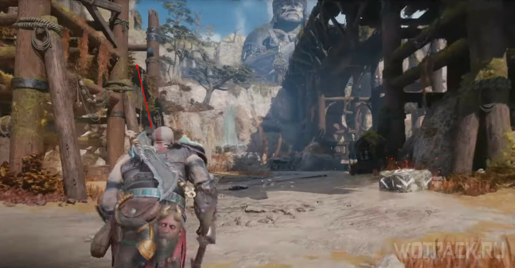 Заберитесь на самую вершину деревянного строения, одолейте врагов и откройте легендарный сундук: внутри Кратоса ожидает первый фрагмент для путешествия в Муспельхейм.