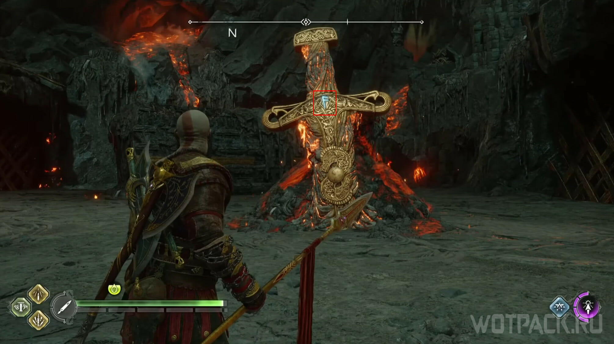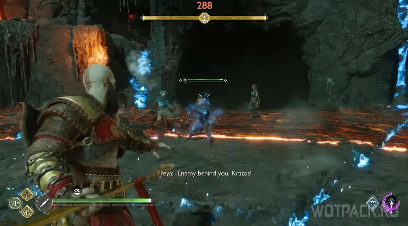 - Заряженная атака копьем Драупнира. Сначала «пододвиньте» жертву поближе к краю, после чего повторите «выстрел» и утопите врага в лаве.