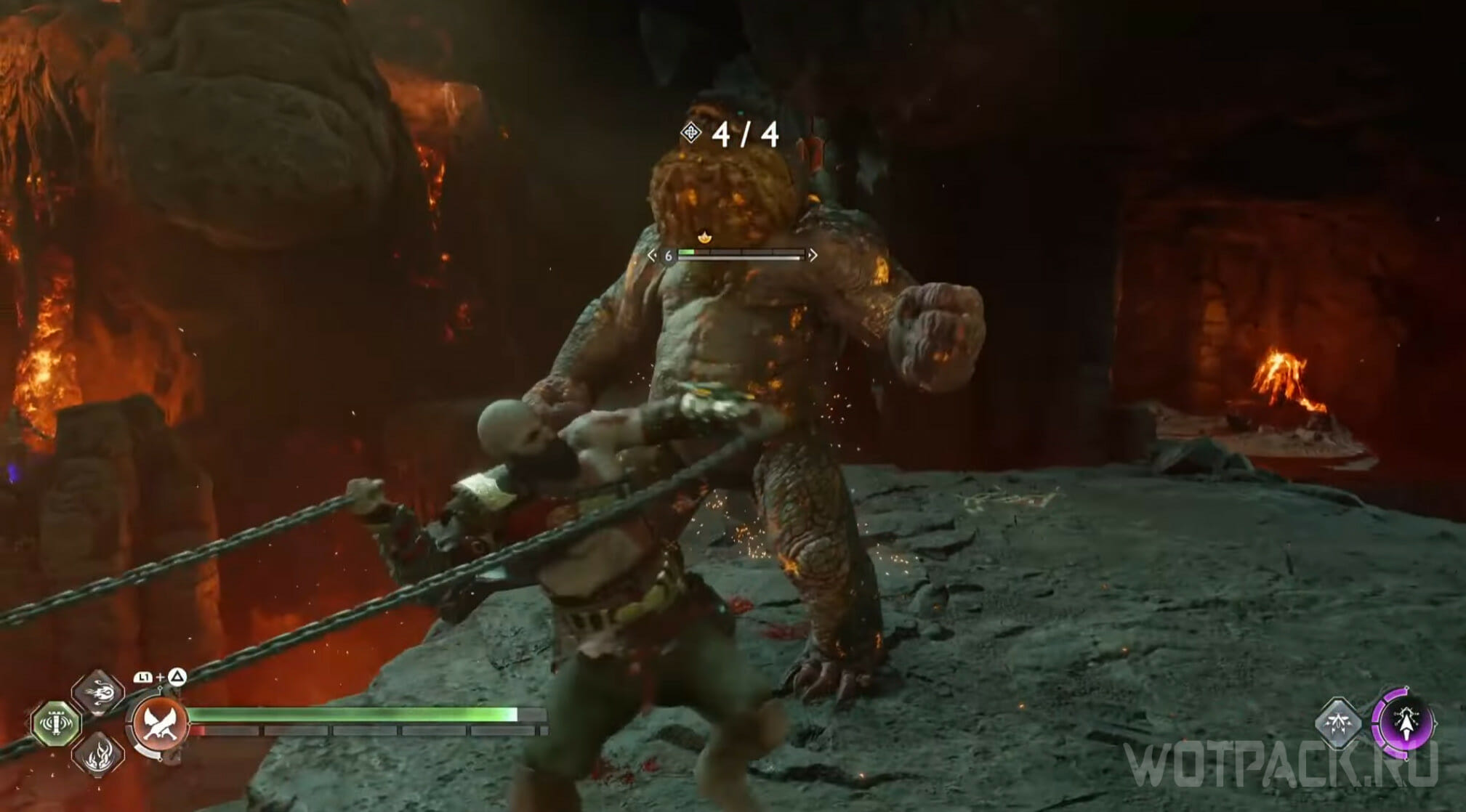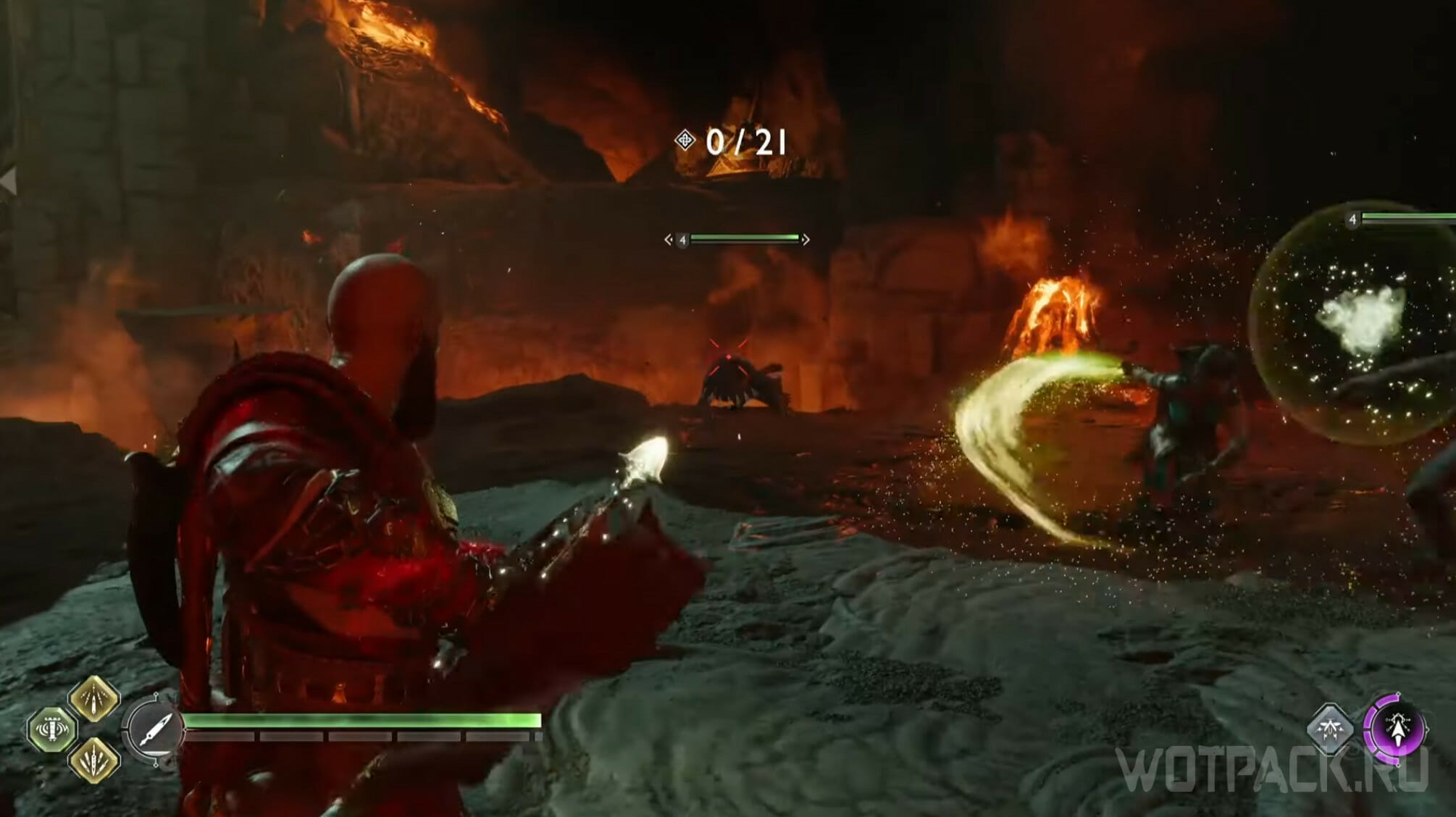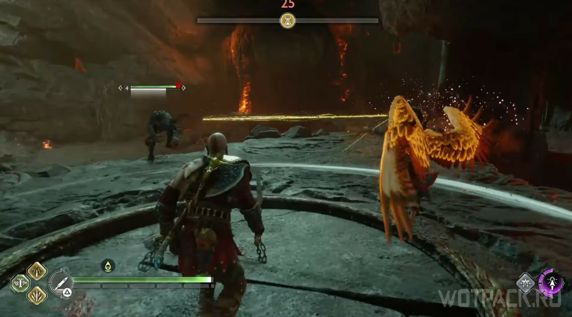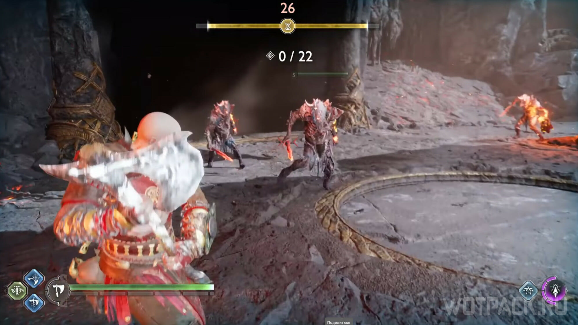 Кратосу нужно победить 15 врагов, не выходя за границы огненного круга: если сделать это, получите урон. В безопасной зоне можно уничтожать противников, но стоит знать, что она постоянно перемещается по арене. Из-за этого лучше расправляться с противниками при помощи Копья. На поле боя также есть ядовитый тотем, к которому может приблизиться круг: если заметили движение в его сторону, заморозьте ловушку Левиафаном.