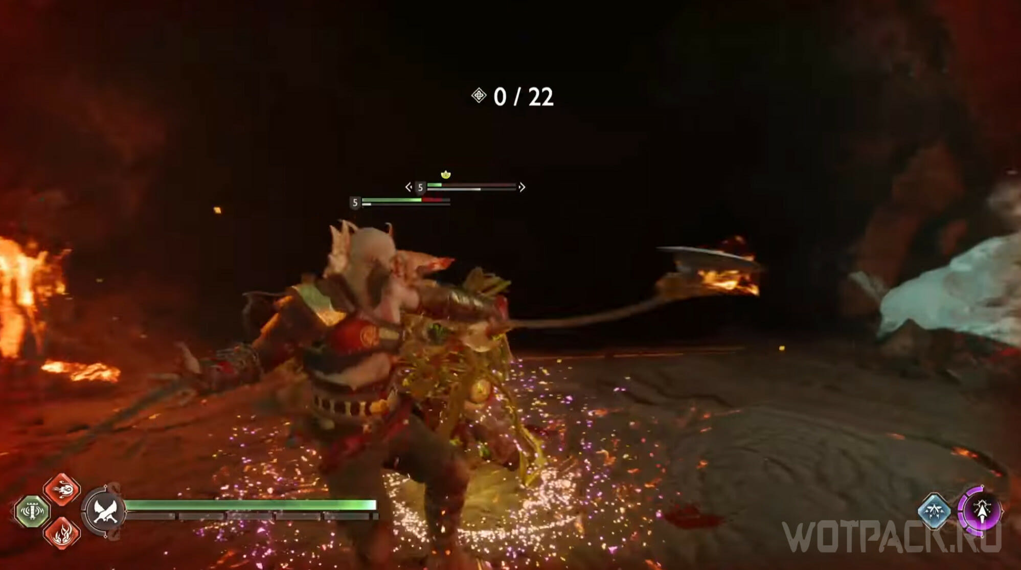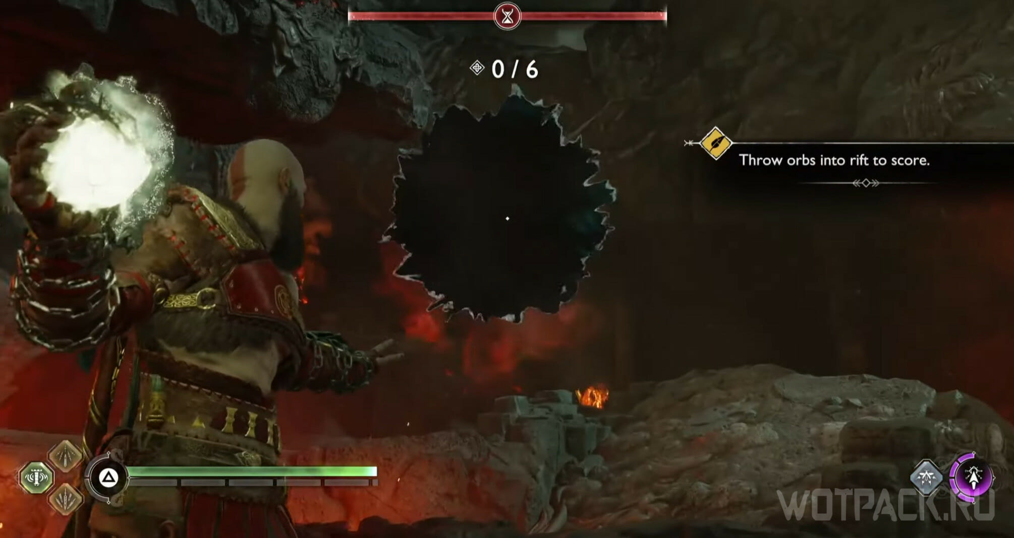 В Натиске [Onslaught Challenge] Кратосу потребуется продержаться 300 секунд в кольце огня, отбиваясь от бесчисленных толп врагов. Оставайтесь внутри безопасной зоны, чтобы не получать урон от лавы и уничтожайте противников, если они подошли достаточно близко, не бегите к ним для намеренных убийств.
