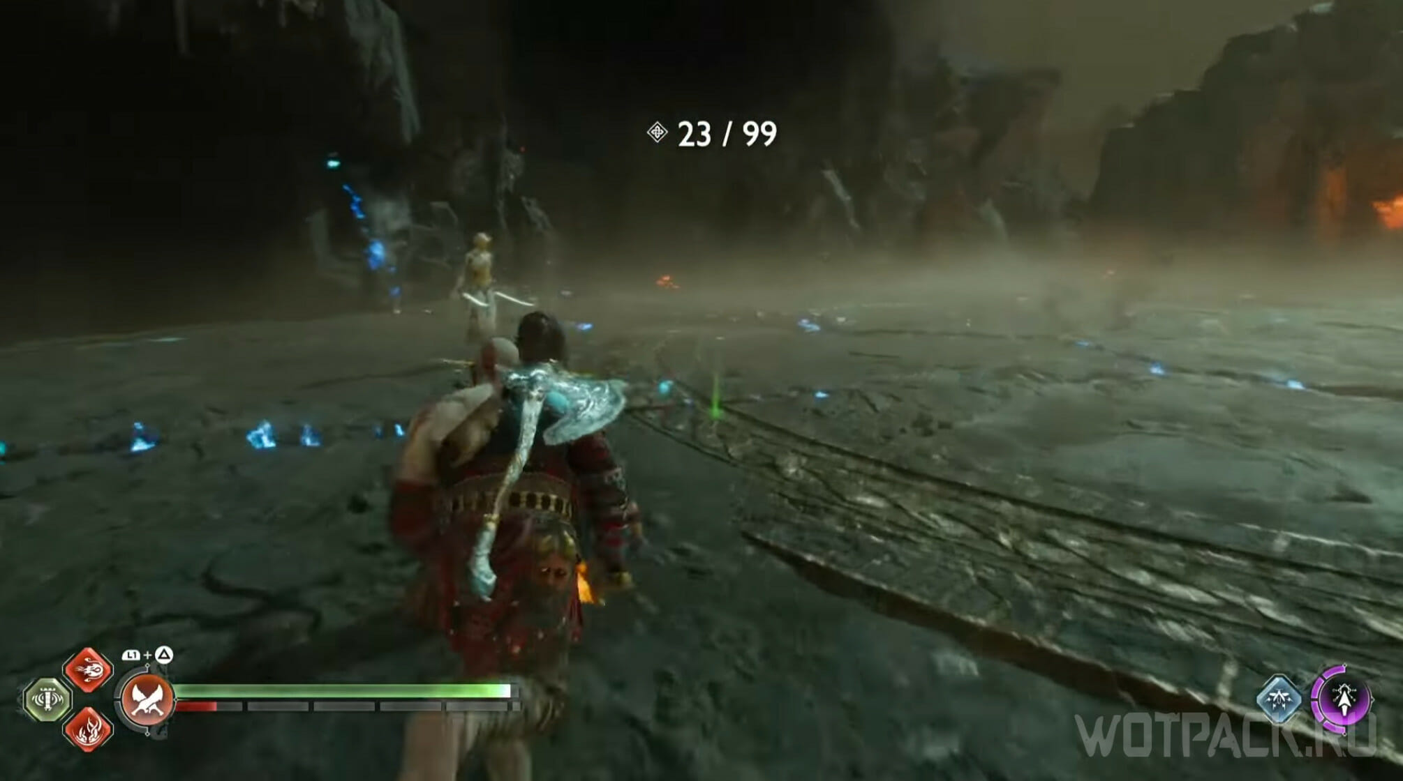 - Бросок топора в ноги. Такой прием позволит сбить врагов с ног, после чего Кратосу нужно подойти ближе и ударить их ногой (R2).