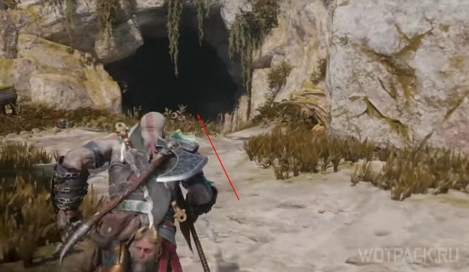 Причальте на Драконий пляж и двигайтесь в сторону огромной статуи. На конструкции слева найдите цепь и вскарабкайтесь наверх. Как только окажетесь наверху, увидите перед собой отверстие для копья: метните оружие и с его помощью поднимитесь на левую часть конструкции. Сверните налево, заберитесь на выступ и перепрыгните пропасть при помощи клинков.