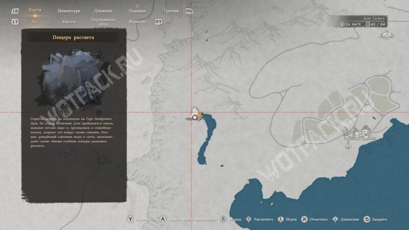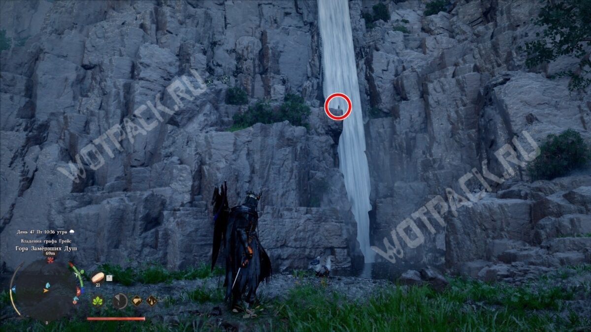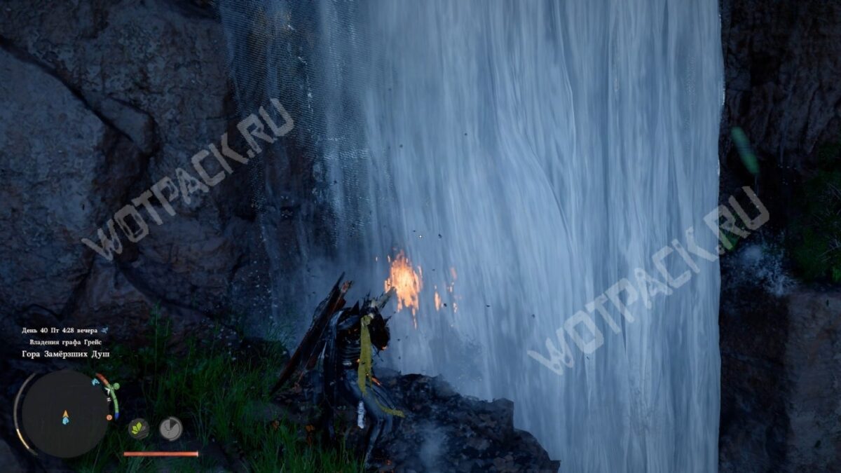 Вход расположен выше уровня водоёма. На уступе стоит столбик из камней — ориентируйтесь на него. Забравшись на нужный уровень, используйте колющий удар, чтобы рассечь воду и оказаться за водопадом.