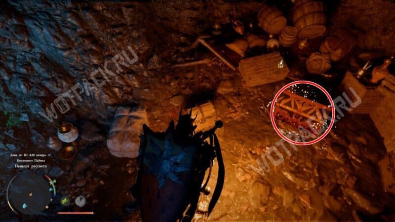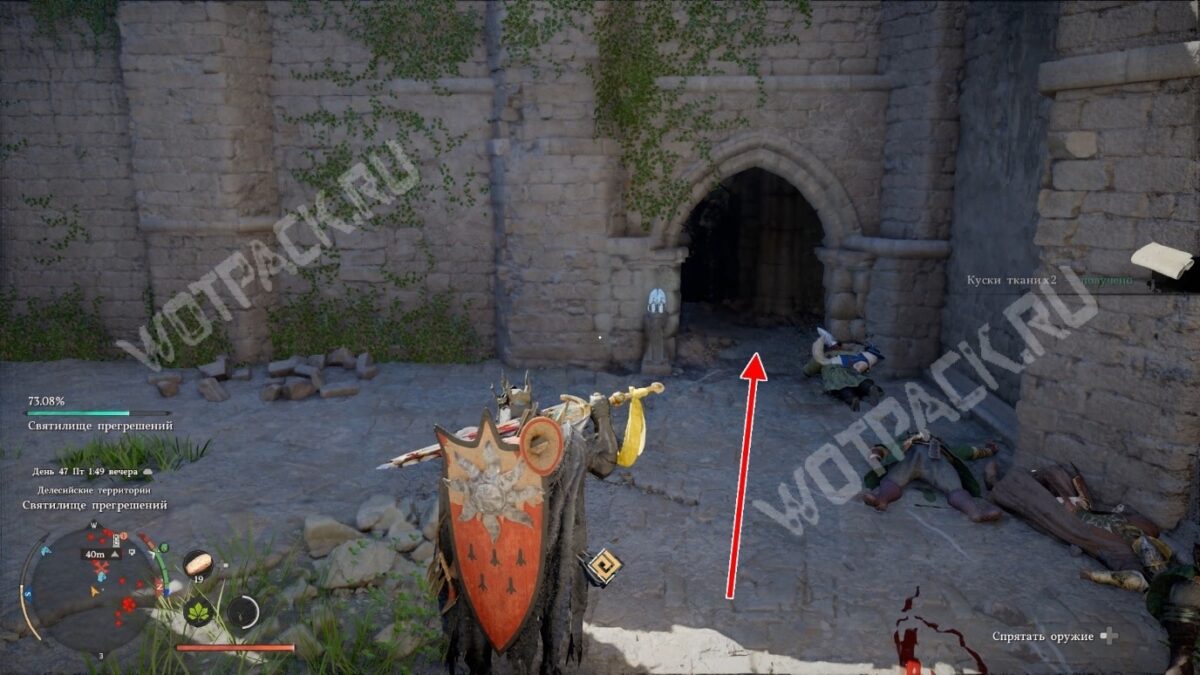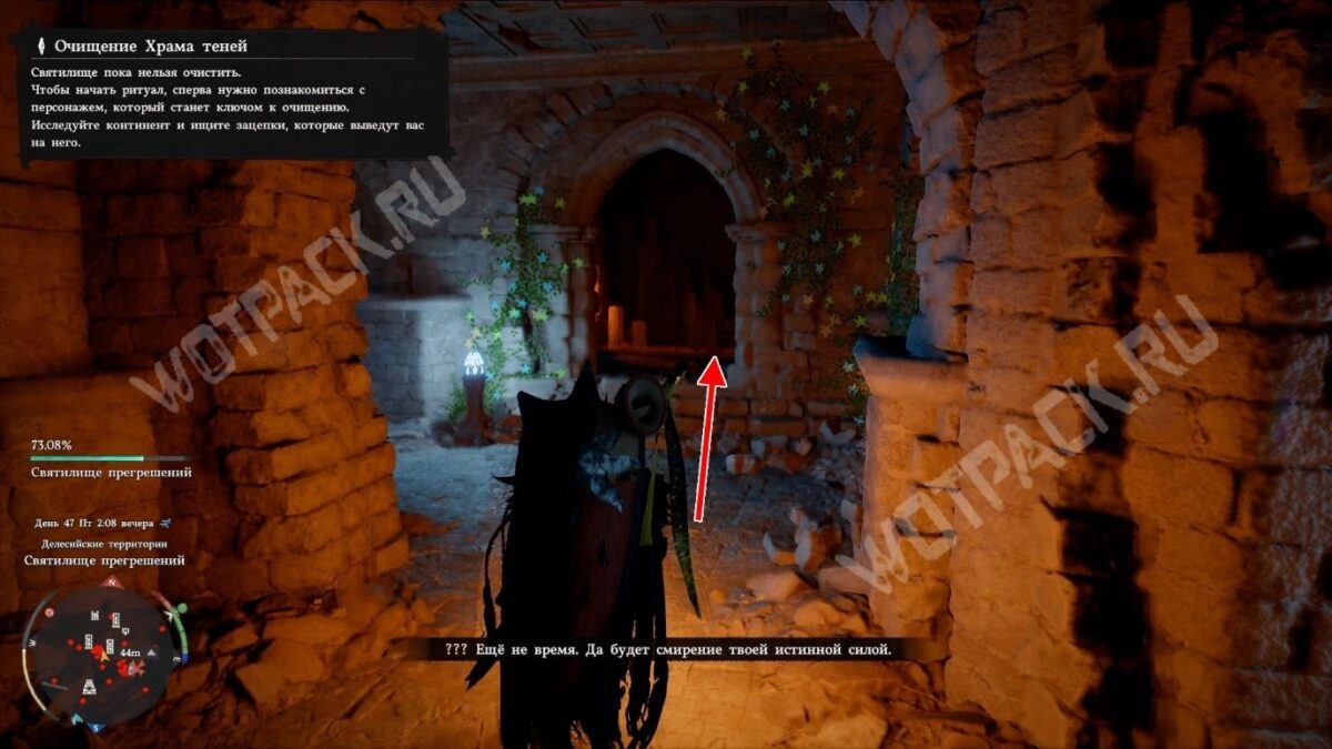 Вернитесь ко входу и идите от него вперёд. Если ещё не встречались с Ведьмой смирения услышите её голос: она скажет, что время проходить испытание ещё не пришло.. Пройдите чуть дальше и обнаружите проём, поросший цветами. Внутри стоит сундук с оружием.