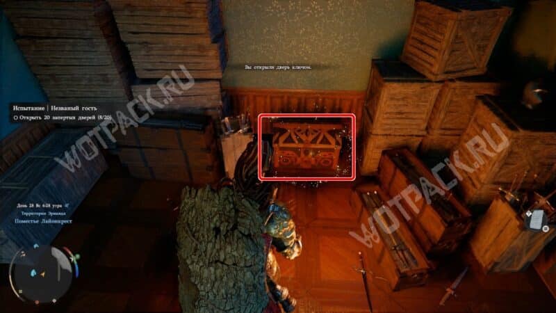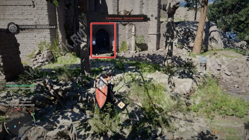 Сундук спрятан в комнате за решёткой. Чтобы её поднять, найдите вход с южной стороны руин. Он охраняется несколькими культистами.