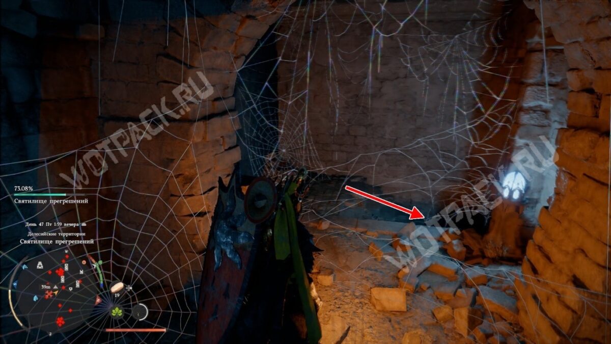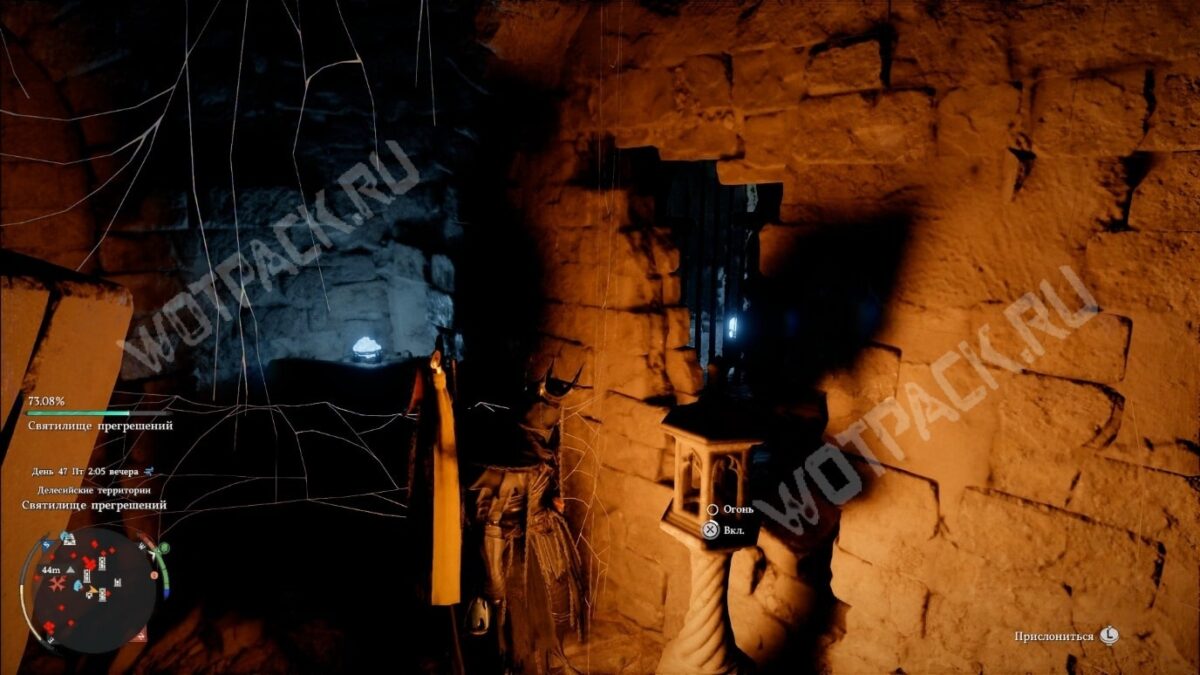Сразу за аркой поверните направо и спуститесь по заросшей паутиной лестнице. Внизу обнаружите комнату, где висит ядро для решения главной головоломки святилища. Здесь также есть каменный факел — зажгите его и решётка за проломом в стене откроется.