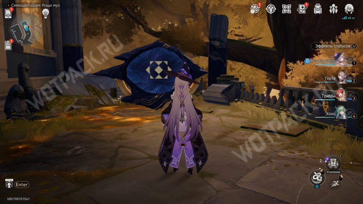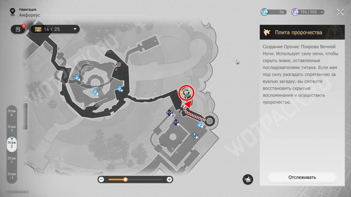 В процессе свободного исследования Омута судьбы пройдите в подлокацию «Гробница прерванного сна», чтобы найти необычную плиту с пророчеством «Хр-хр». Для получения подсказок можно отправиться на поиски нимф созидания, а после их сбора приступать к решению.