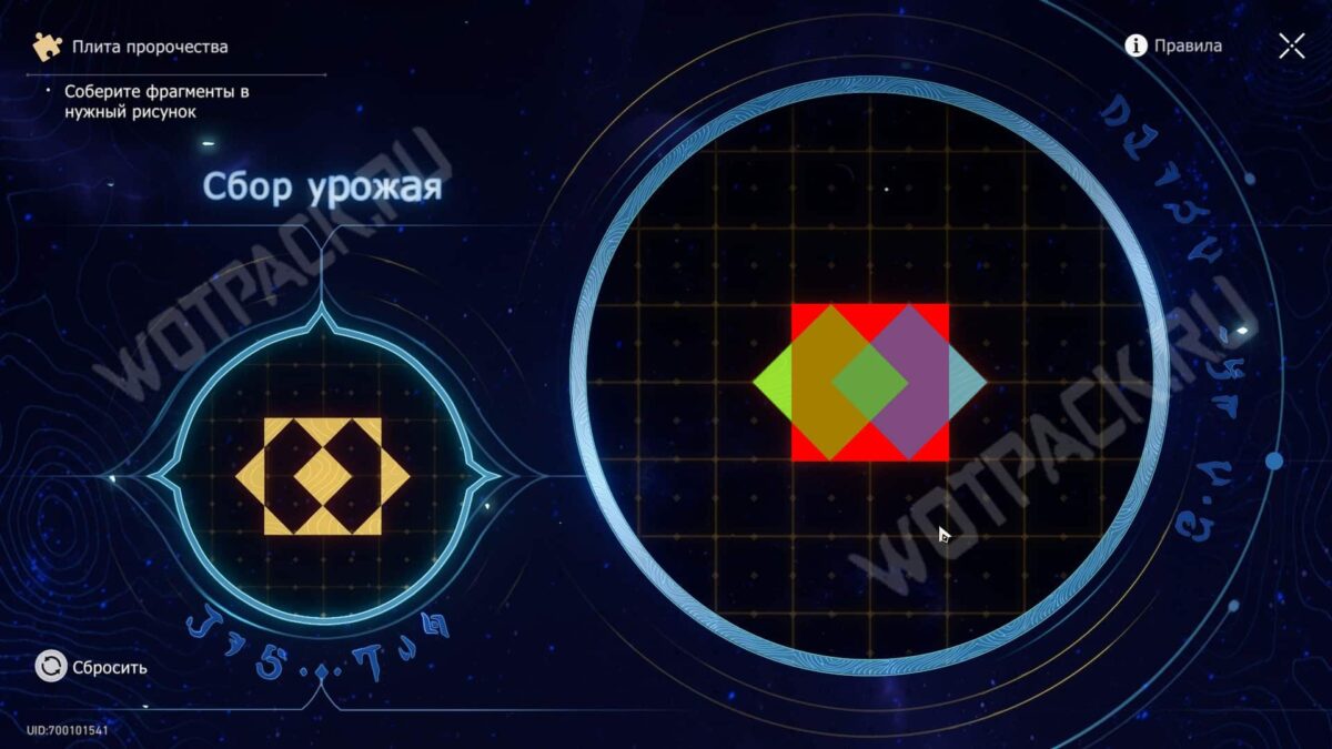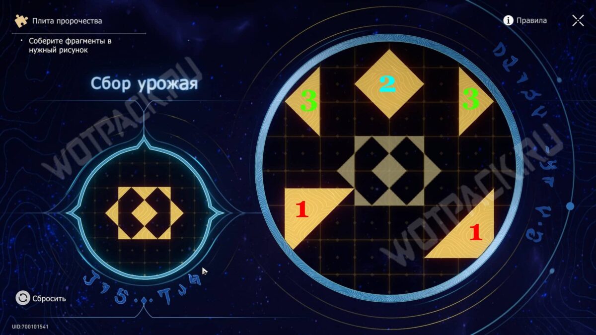 На севере Старой каменоломни можно найти плиту пророчества «Сбор урожая» — категорию головоломок, за решение которых можно получить щедрое вознаграждение. Выполните следующие шаги, чтобы составить правильный рисунок: