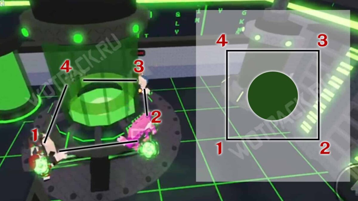 - Расположитесь в форме квадрата, не затрагивая конвейер и развернув юнитов спиной друг к другу.
