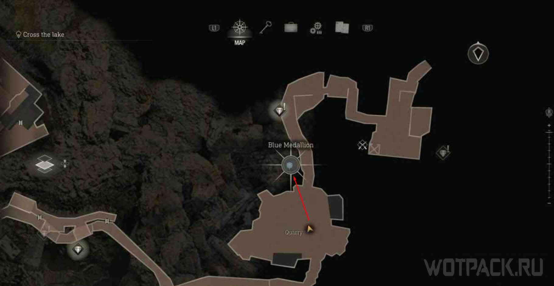 От крупной площади с надписью «Карьер» на карте, от места, где сбиваете сокровище, посмотрите на леса слева. На одном из деревянных лесов висит медальон.