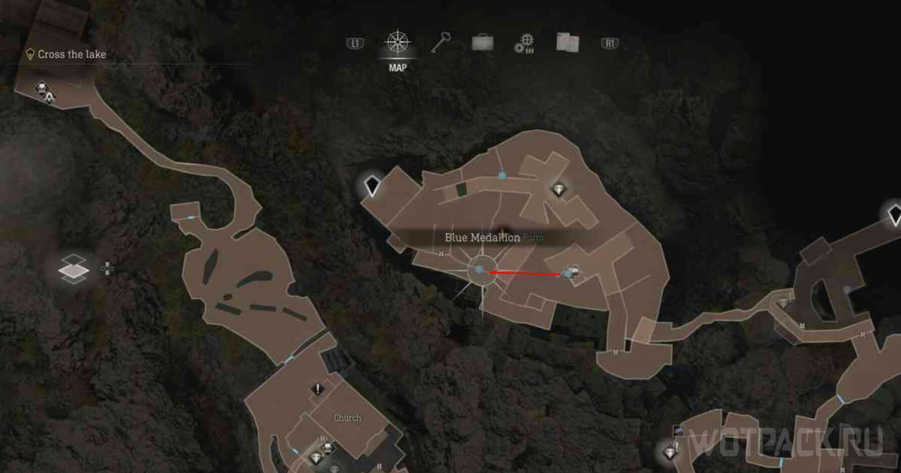 Второй медальон находится на северо-западе от первого. Найдите хлев, где обитают коровы, там обнаружите и предмет. Можно выстрелить через окно или зайти внутрь и уничтожить изнутри.