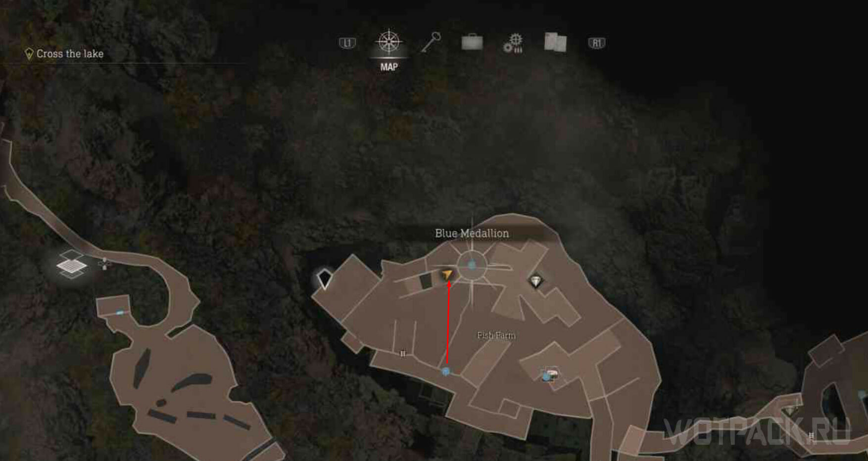 Находится в восточной части рыбопитомника. Спуститесь к воде и пройдите к маркеру. Впереди находится деревянное строение. Через отверстия в досках можно увидеть медальон.