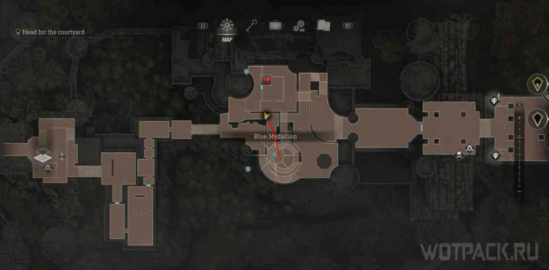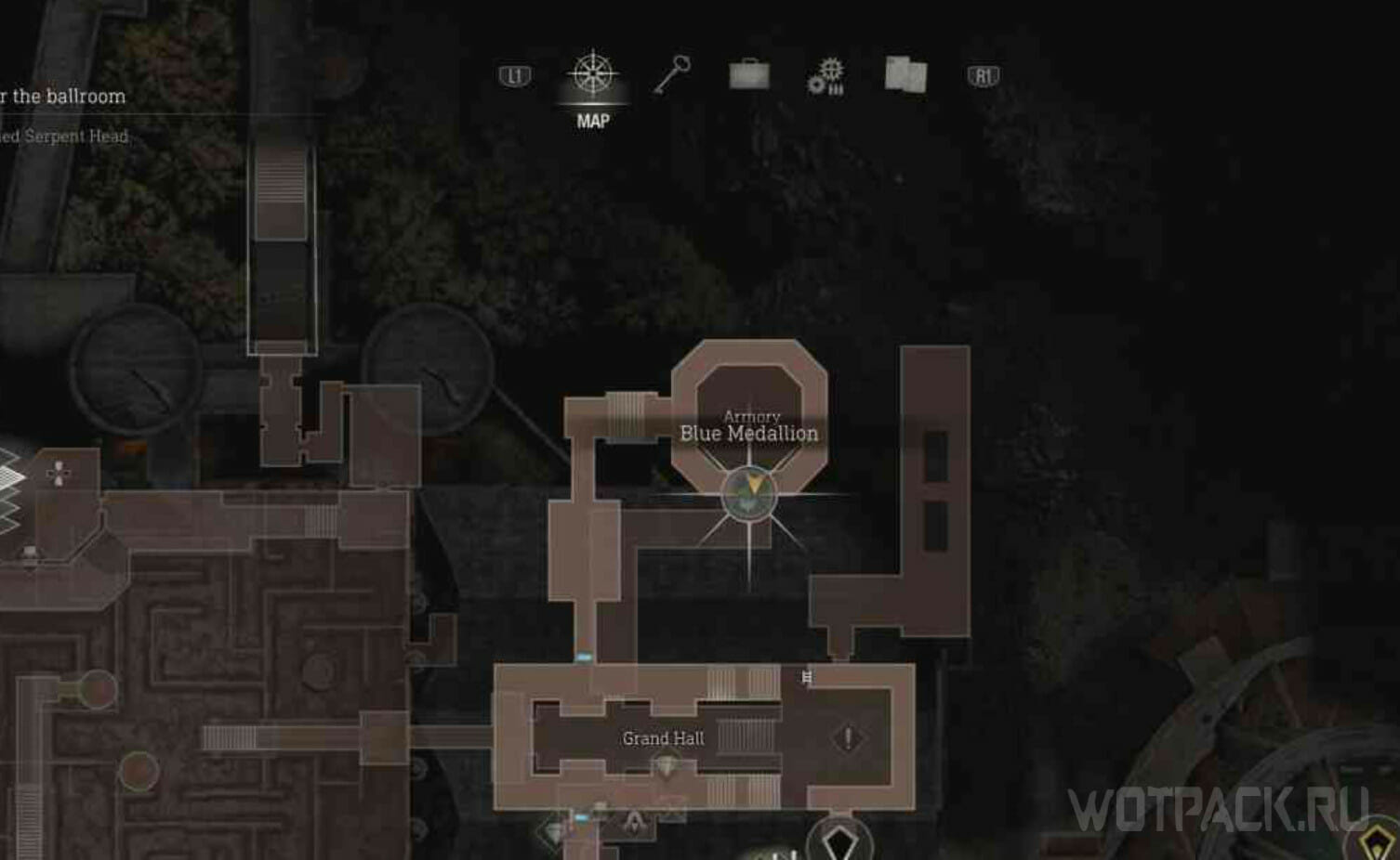 Вернитесь назад к месту, где расположены ворота, ведущие в лабиринт. Перед тем как зайти в него, посмотрите в углубление в коридоре на юге. Там в арке найдете медальон.