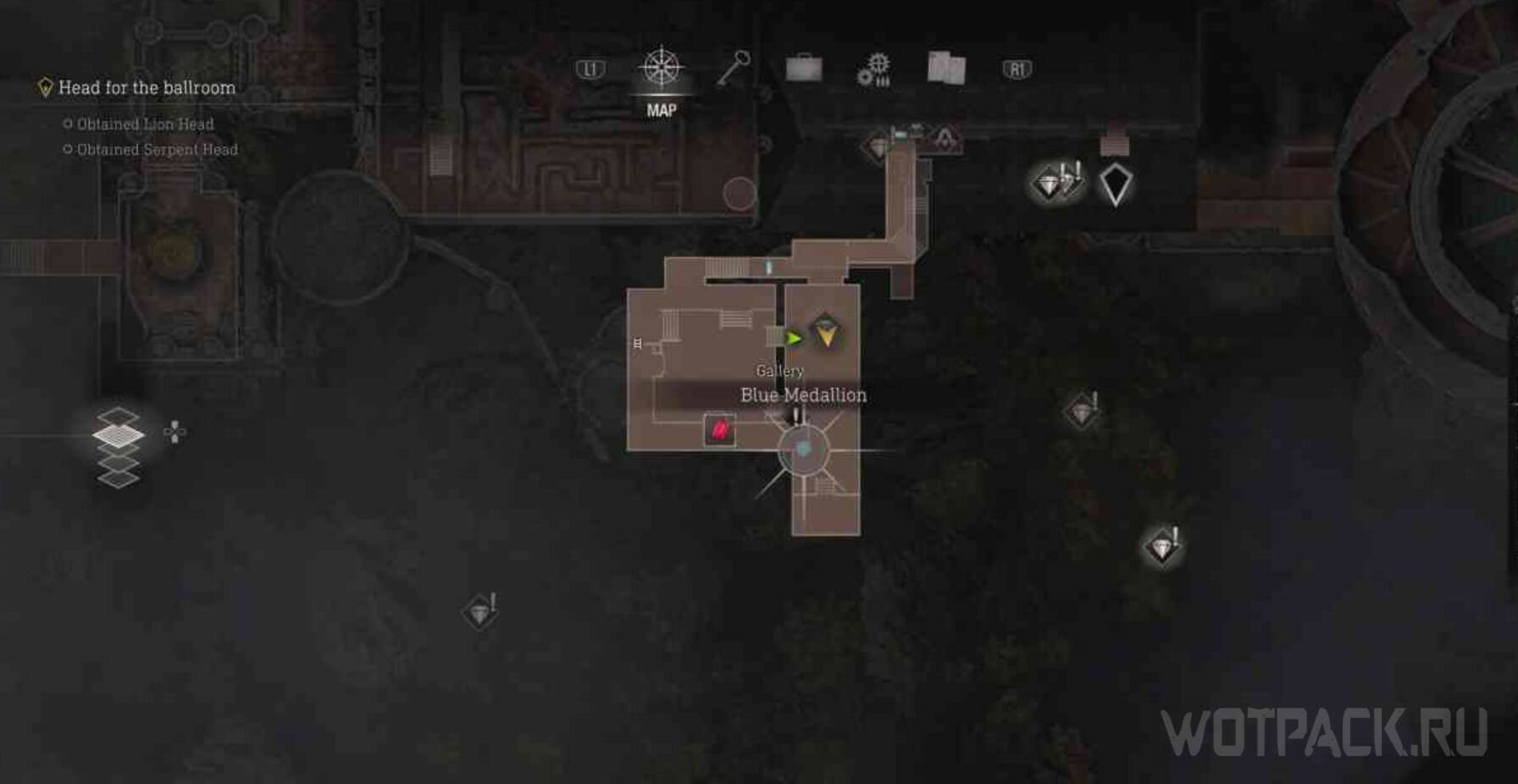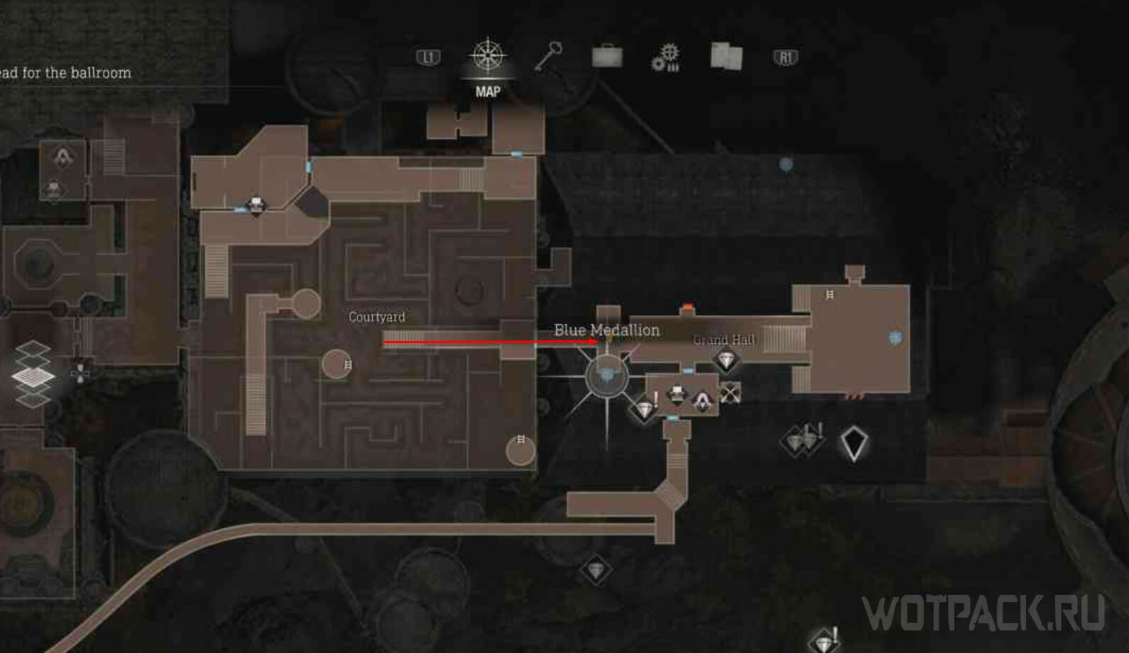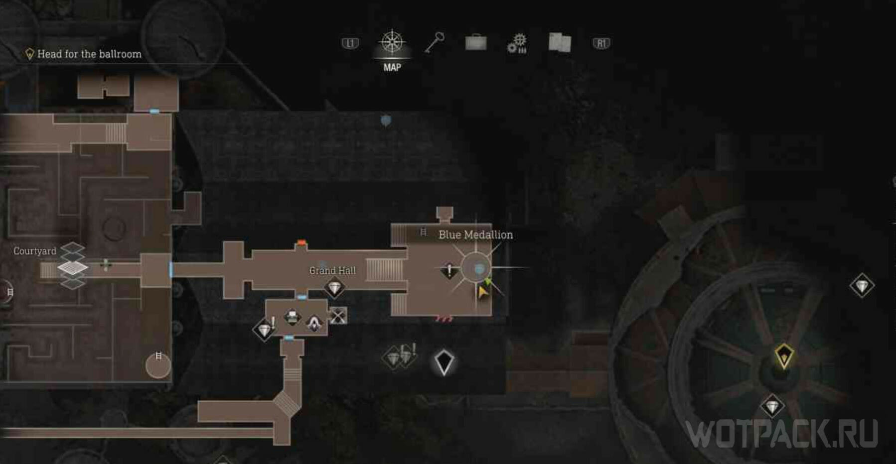 От первого медальона пройдите дальше в Большой зал. Позади безголовой статуи (сюжетного объекта) стоят колонны, за одной из них висит синий медальон.