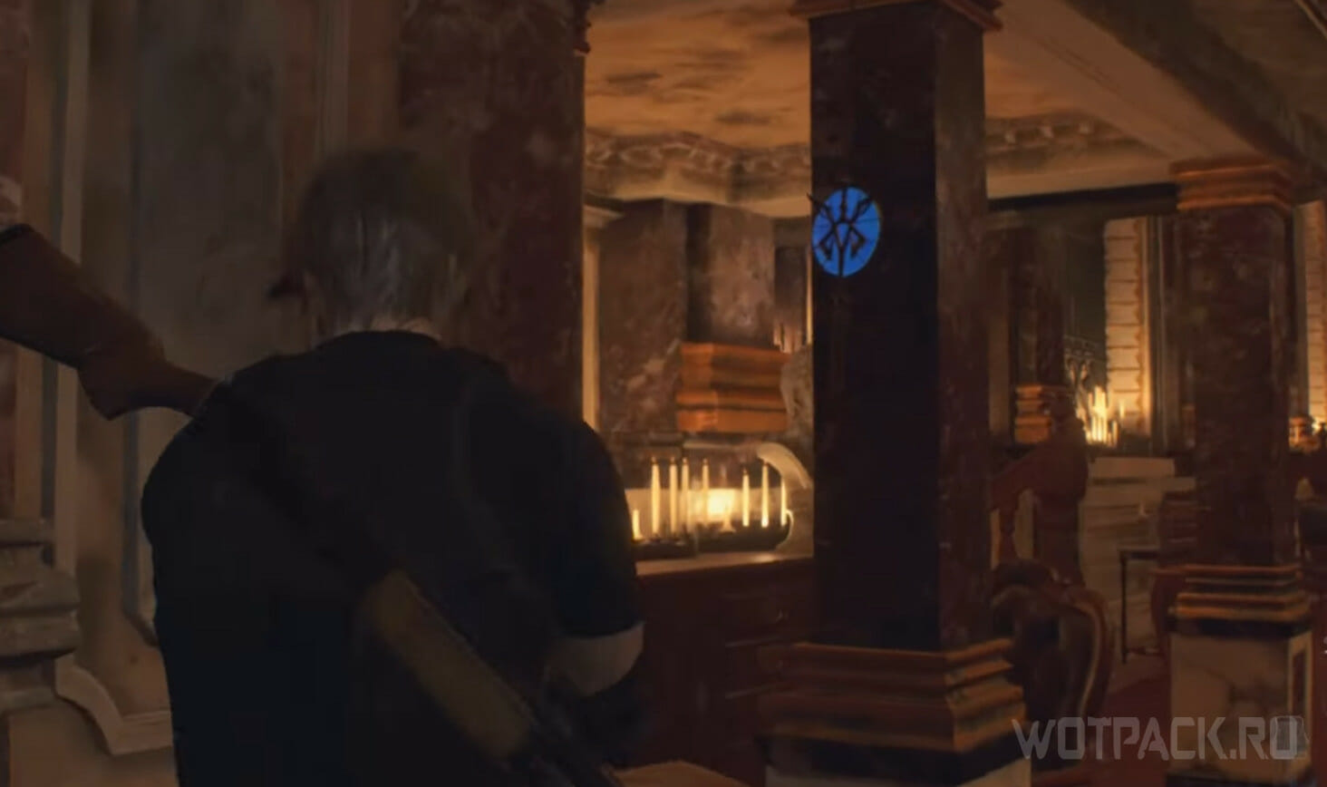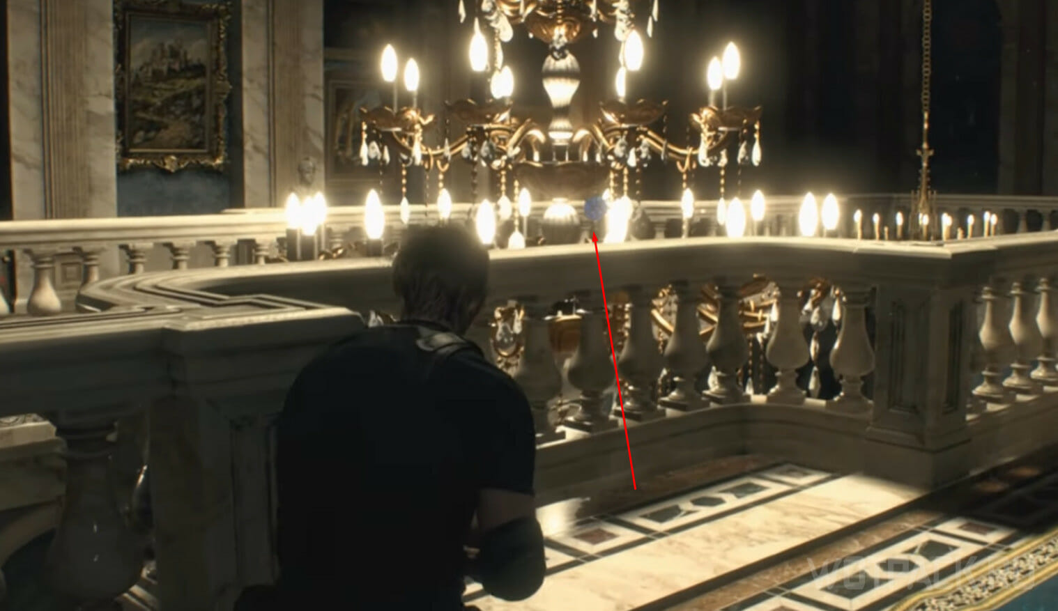 Вернитесь в Большой зал и поднимитесь на второй этаж. В центре висит большая люстра, а к ней прикреплен символ сектантов, который Леону и нужно разбить.