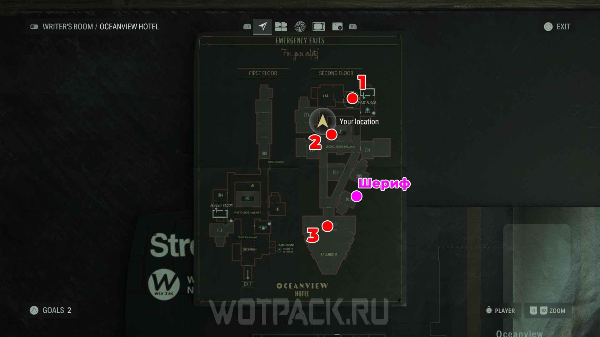 В коридоре верхнего этажа посмотрите через стекло над левой дверью, ведущей на лестничную площадку, и заметите Слова. Можете войти в номер 209, где будет шериф с заготовленной картой. Ключ от двери спрятан в комнате 206 напротив.