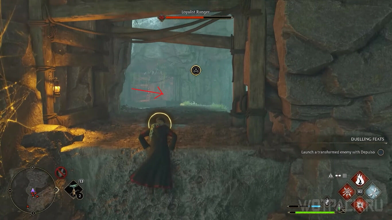 Переместитесь к Впадине с мурлокомлями на востоке Запретного леса и войдите внутрь. Идите по проходу, расчищая себе путь заклинанием Конфринго и перепрыгивая расщелину в полу, пока не встретите деревянную преграду.
