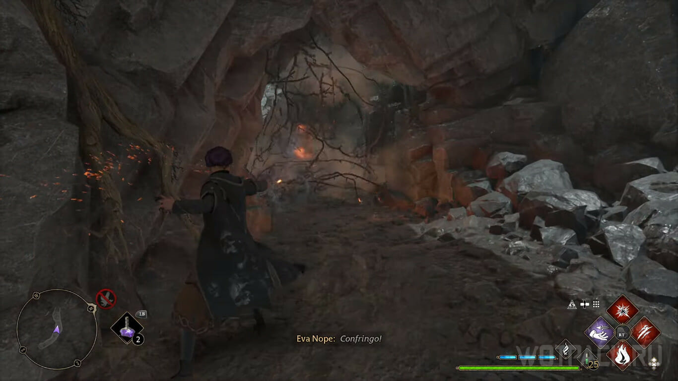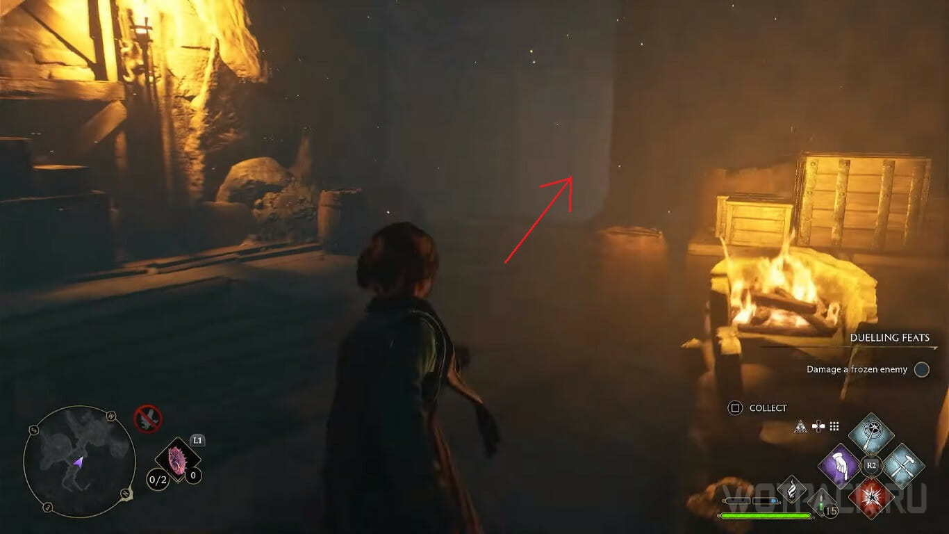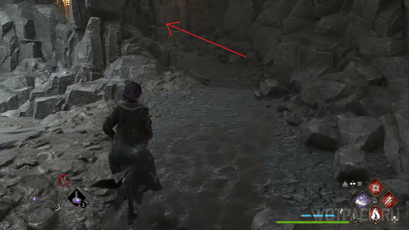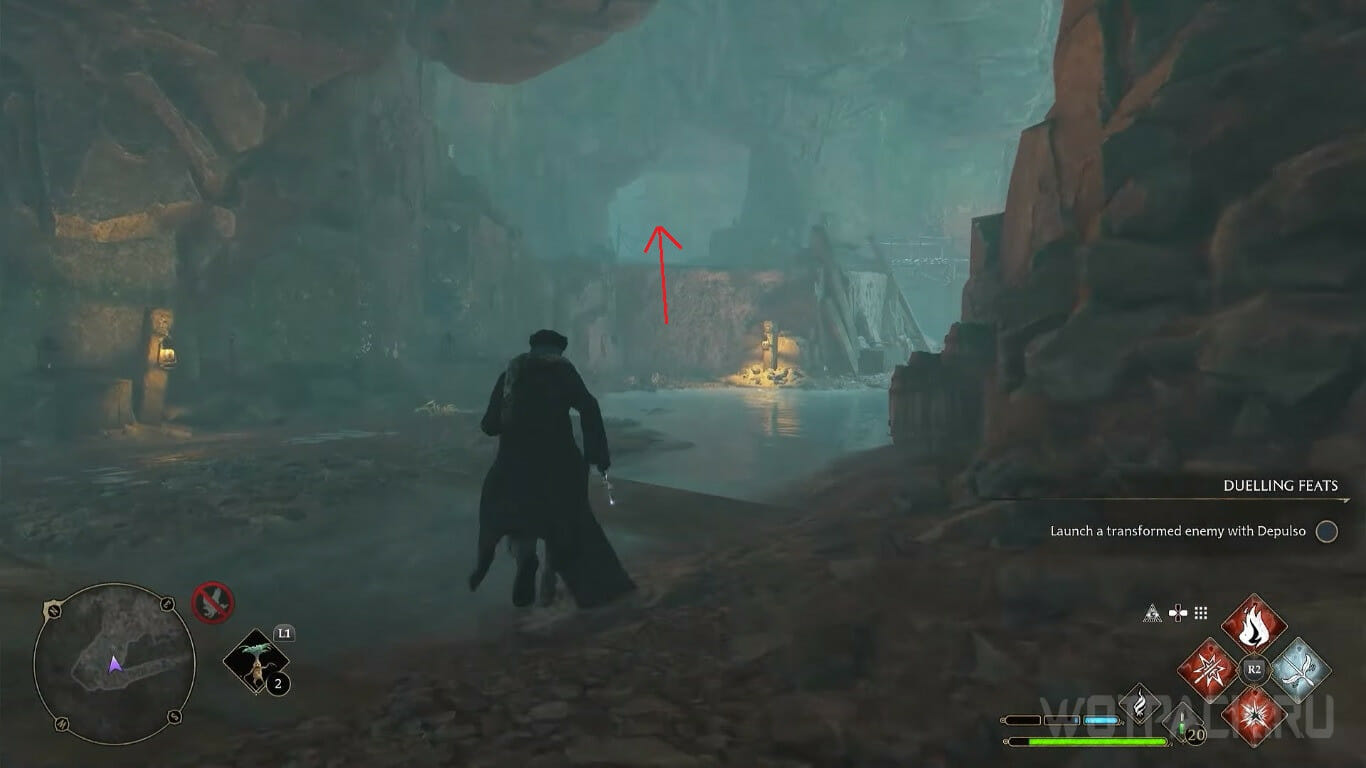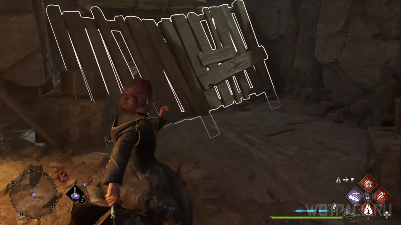 От предыдущего сундука бегите обратно, к противоположной стороне пещеры, где увидите ящик и поверхность, по которой можно забраться. Перенесите предмет при помощи Вингардиум левиоса ближе к стене и поднимитесь на уровень выше.