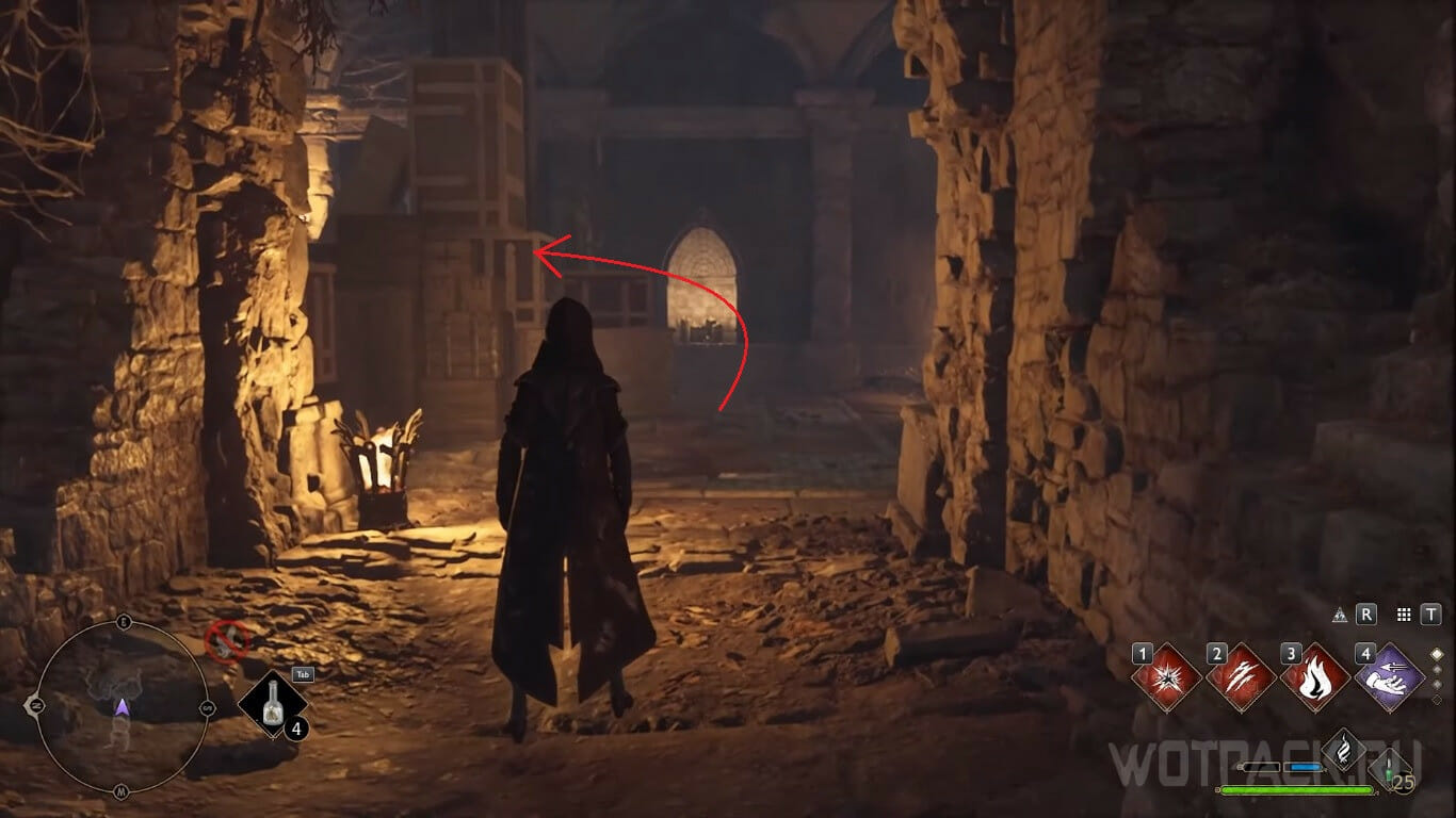 Переместитесь к Большой лестничной башне и спуститесь по исчезающей лестнице на один пролет, чтобы наткнуться на двери с символами. После решения головоломки можно будет открыть ларец с рецептом и еще один — с предметом экипировки.