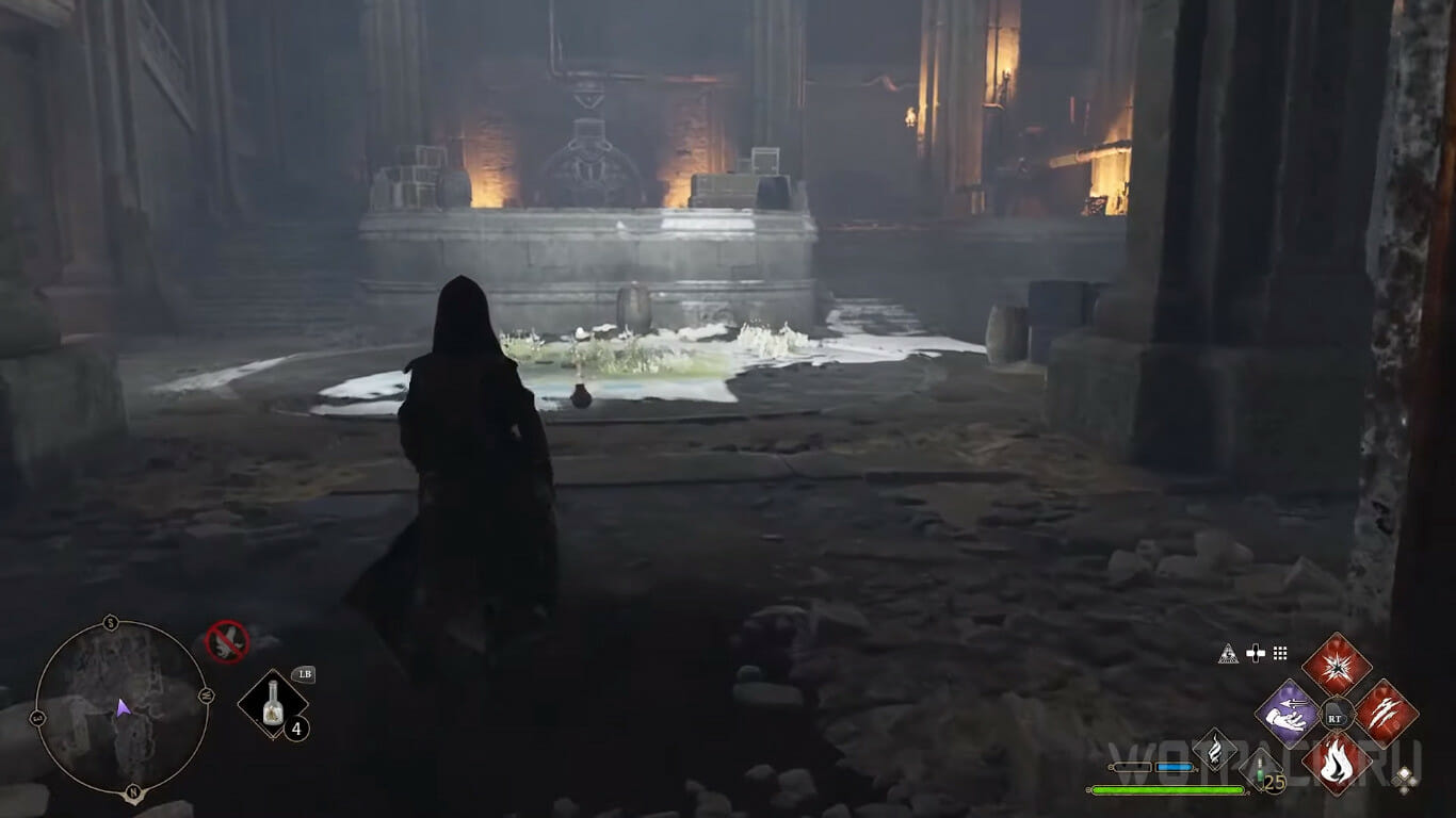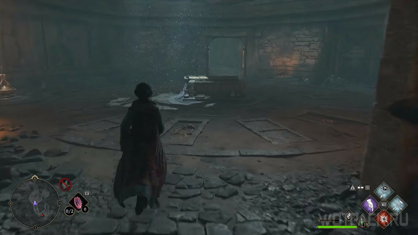 Заморозьте маятник заклинанием Арресто Моментум напротив третьего круга с символом змей и войдите в комнату в правом дальнем углу, где стоят два сундука с рецептом и рукоятью.